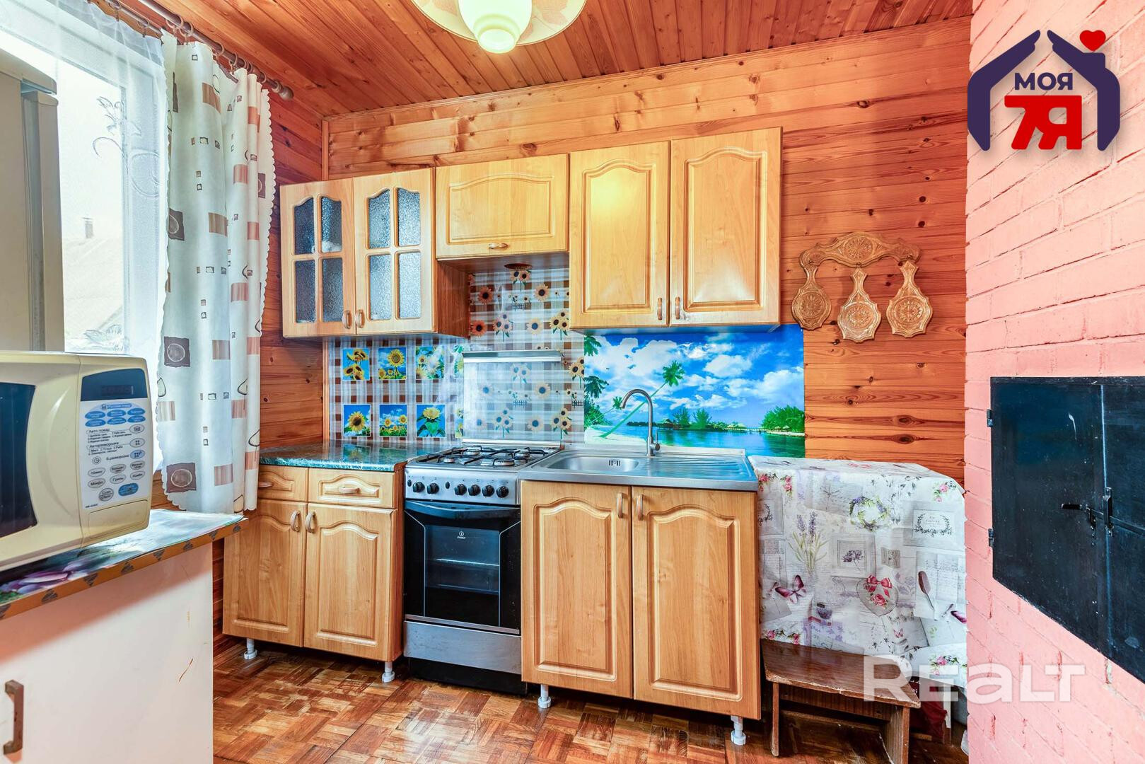 В доме установлены добротные деревянные двери и лестница. Кухня полностью обустроена для приготовления пищи: тут есть качественная деревянная мебель, плита, оригинальный фартук с декором, обилие света.