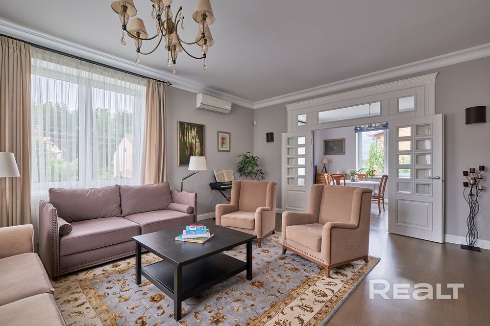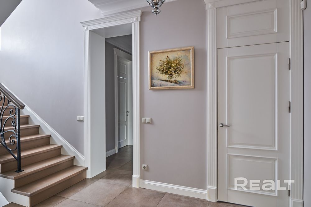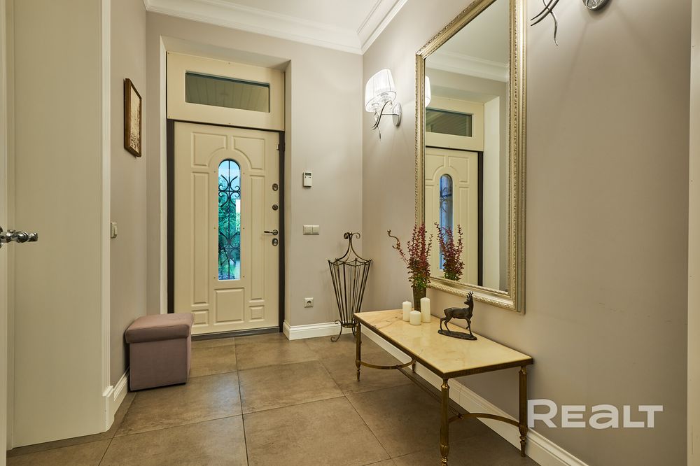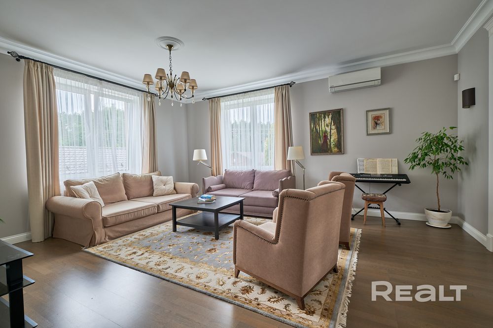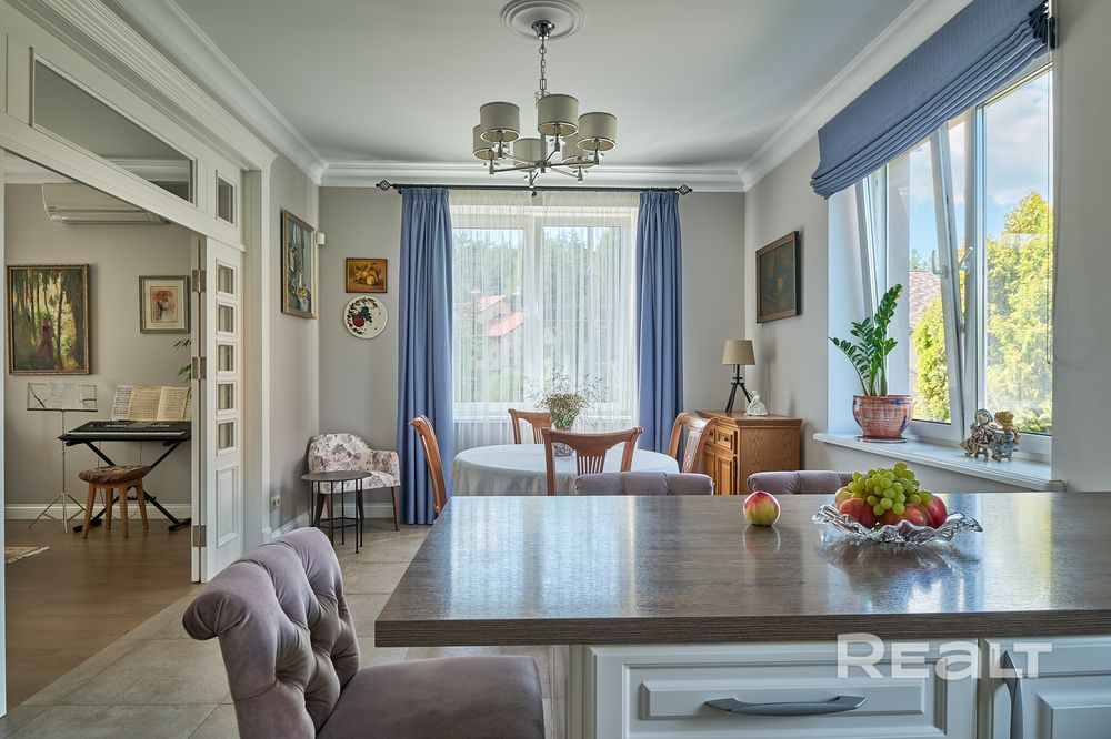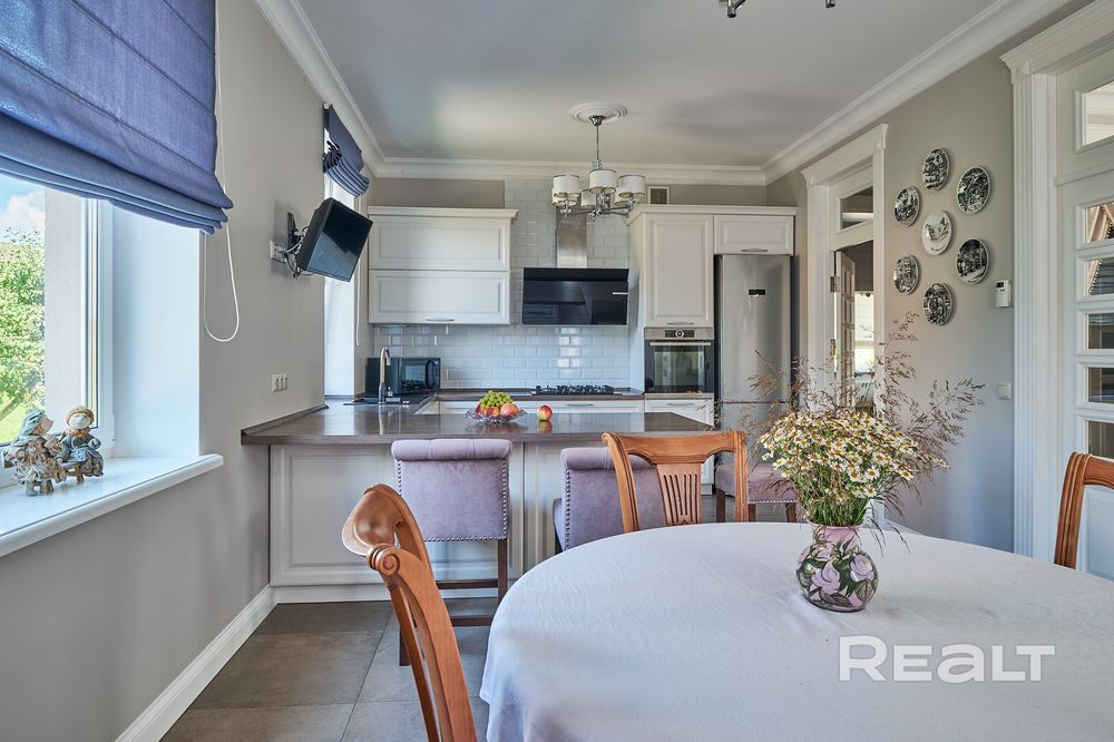 Расположен он в глубине поселка, в респектабельной застройке — вокруг зелень, тишина и приятное окружение. До Минска — всего 15 минут езды, удобный выезд на городские трассы. Это отличный вариант для тех, кто ищет качественный дом под Минском с готовым интерьером.