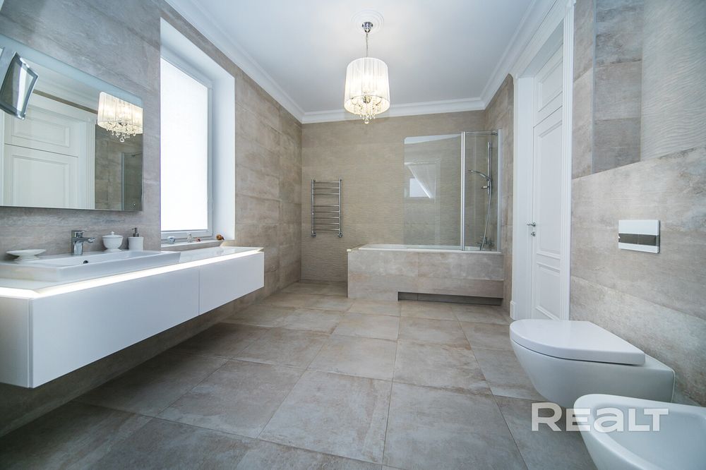Внутренняя отделка выполнена из качественных материалов: испанская плитка с подогревом, паркетная доска BOEN, сантехника Villeroy & Boch. Обрщают на себя внимание дверные проемы нестандартной высоты с окнами над ними. Интерьер обставлен новой мебелью. Как вы можете видеть, современная классика сильно отличается от тяжеловесной и позолоченной «дворцовой», которую мы привыкли видеть в коттеджах из 90-х. Здесь интерьер светлый, тёплый и гармоничный, создает ощущение уюта и пространства.