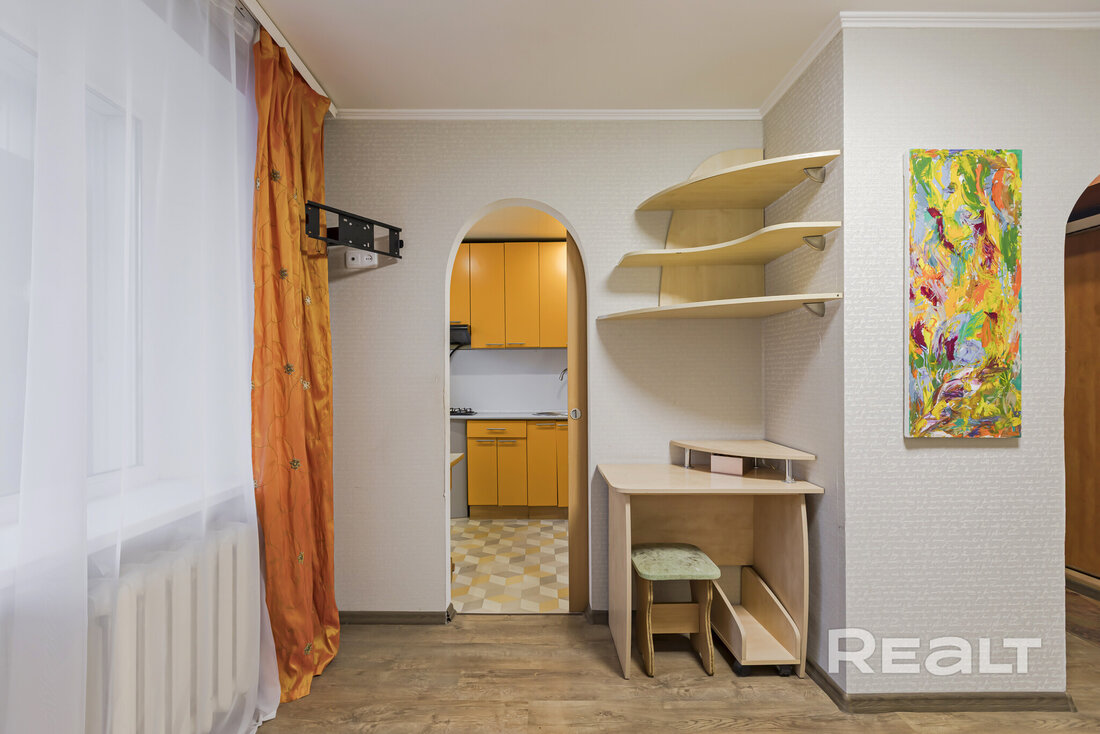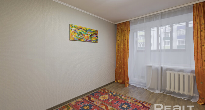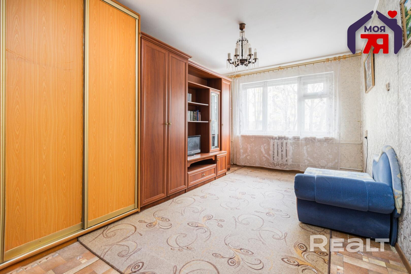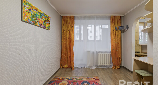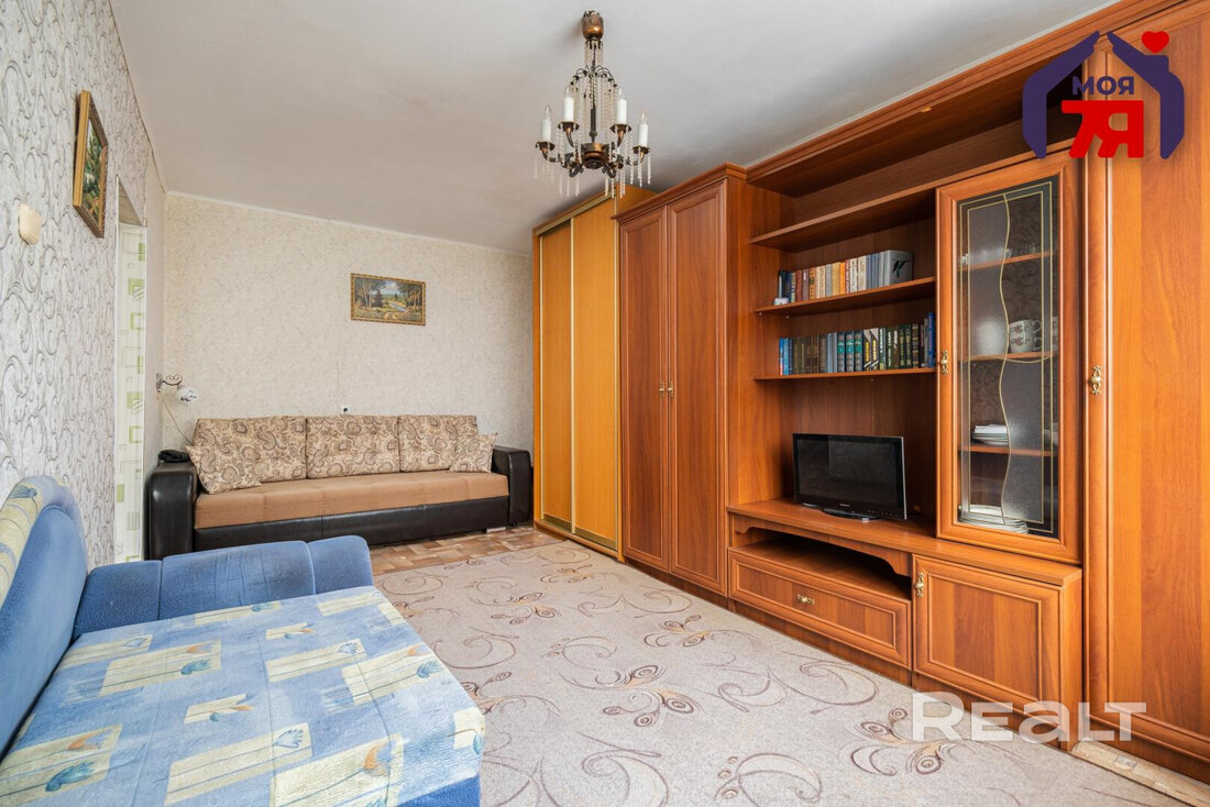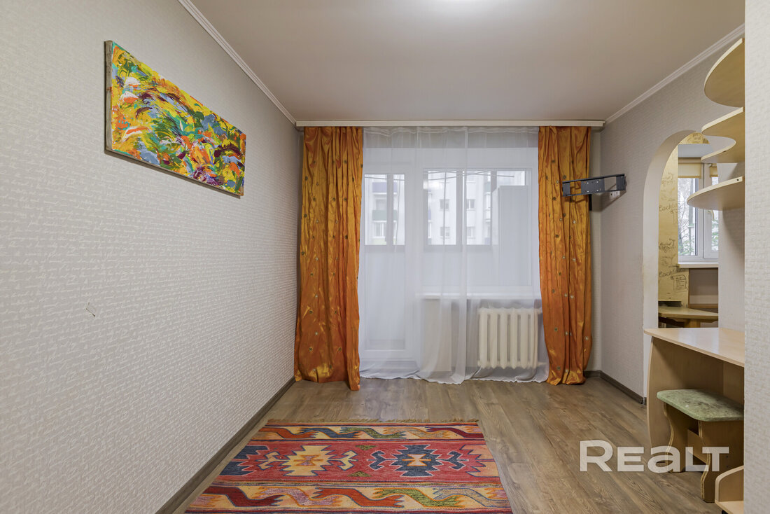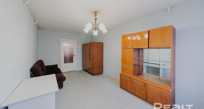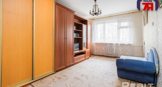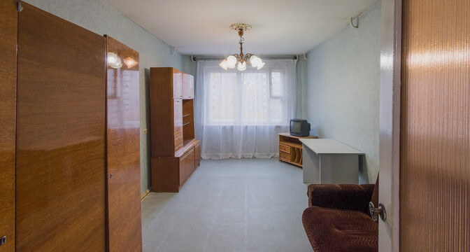 Квартира нуждается в обновлении. На полу лежит ламинат, в окнах стоят стеклопакеты. Жилье продается со всем, что есть на фото. Из комнаты имеется выход на застекленный балкон.