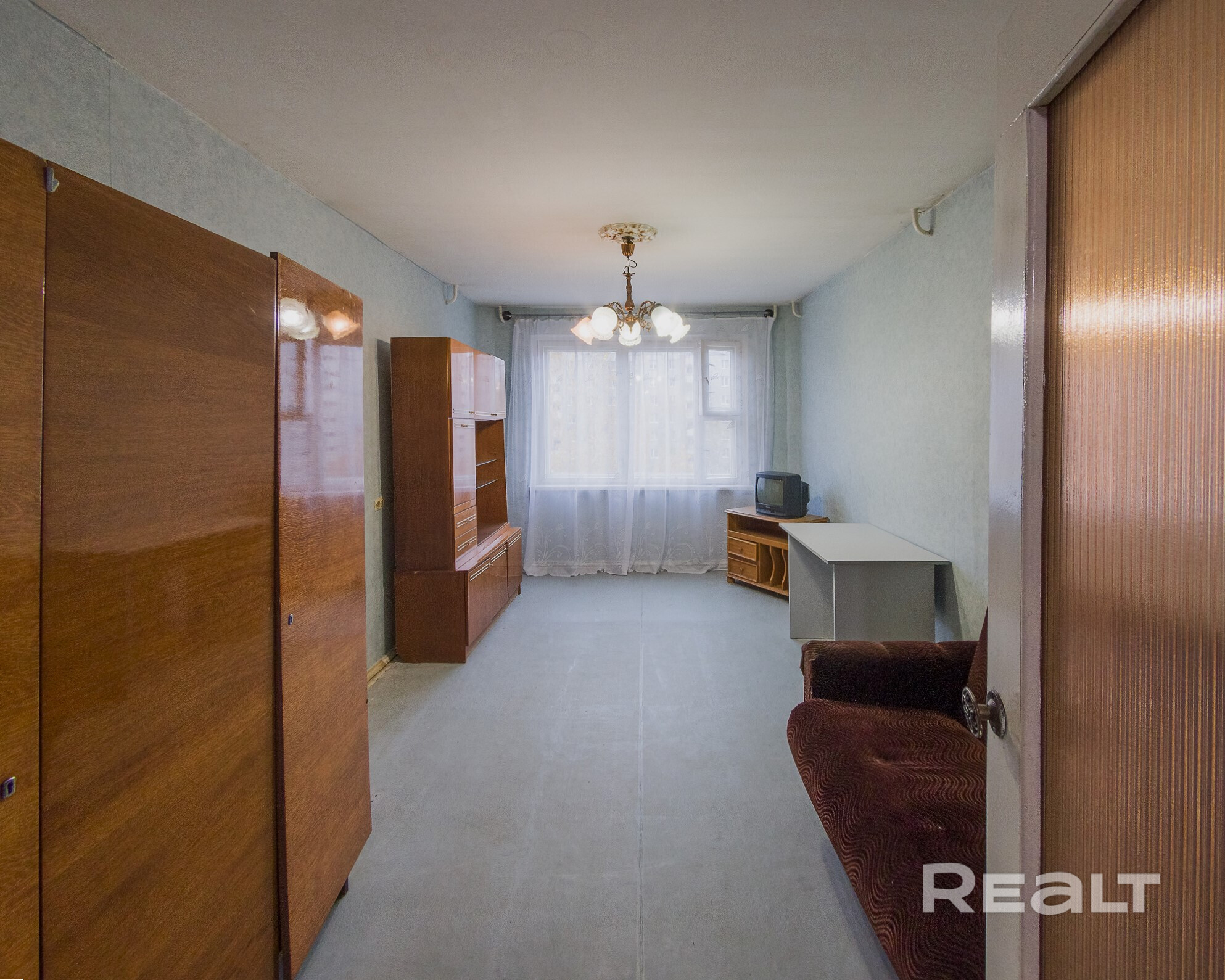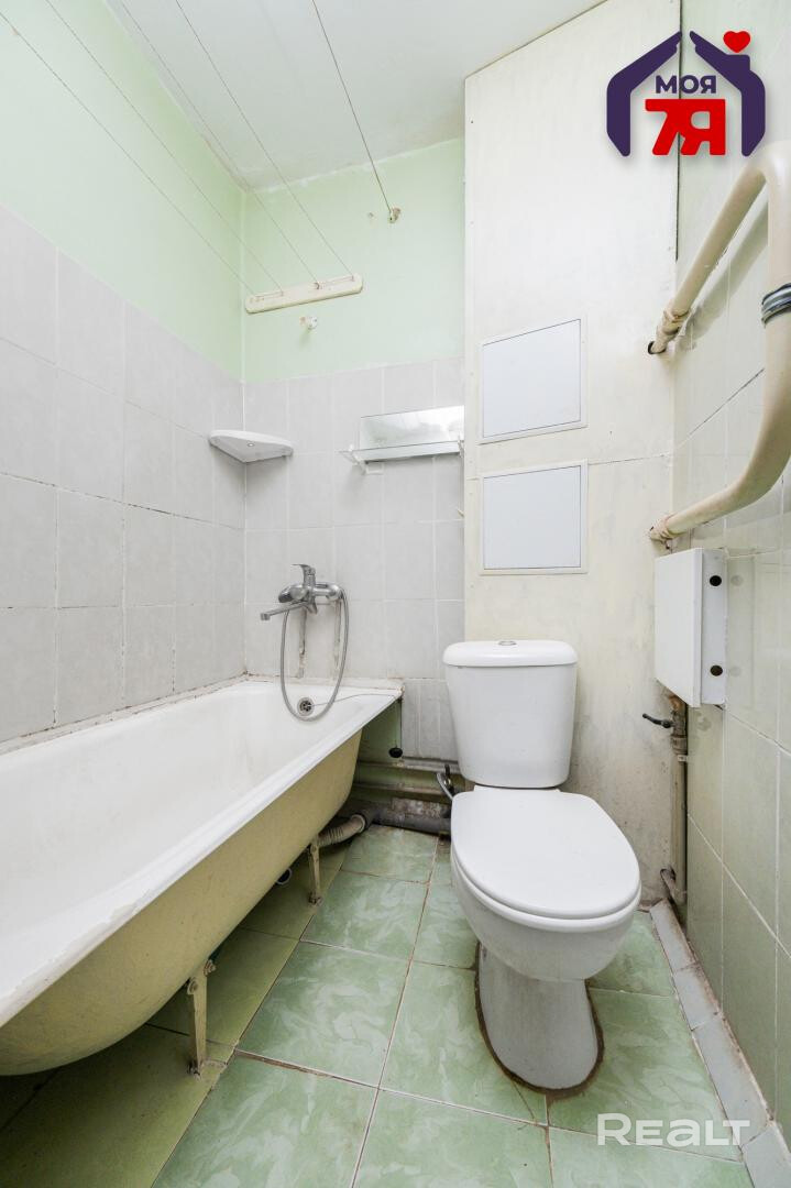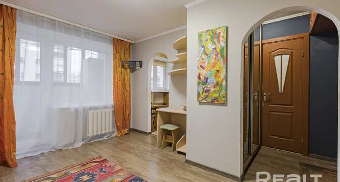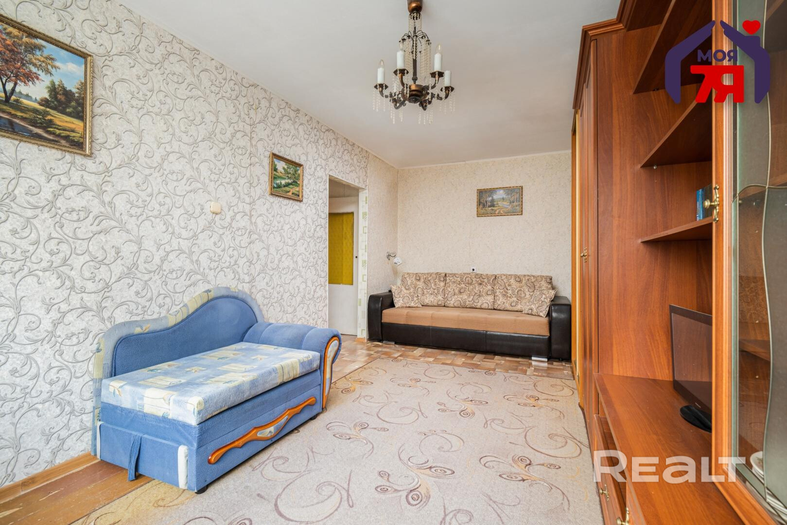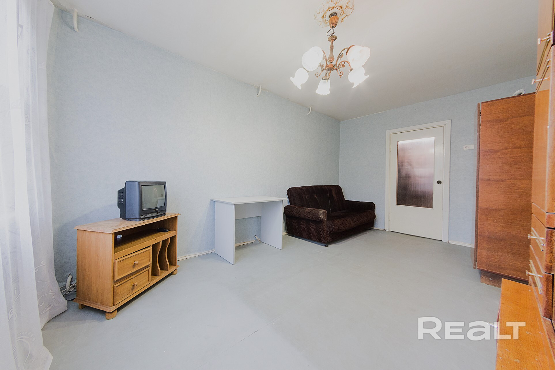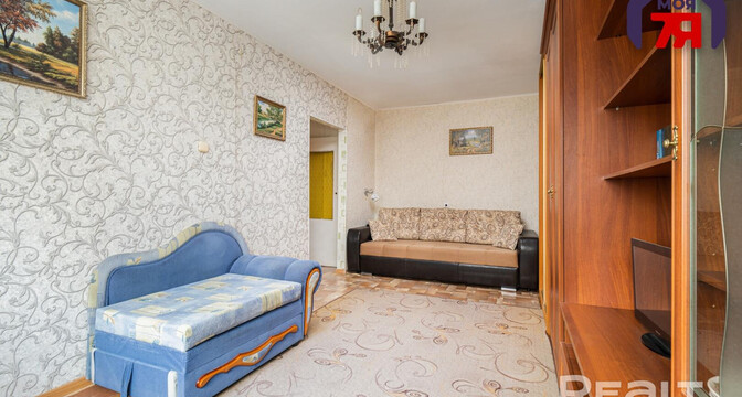 Квартира нуждается в обновлении. На полу лежит ламинат, в окнах стоят стеклопакеты. Жилье продается со всем, что есть на фото. Из комнаты имеется выход на застекленный балкон.