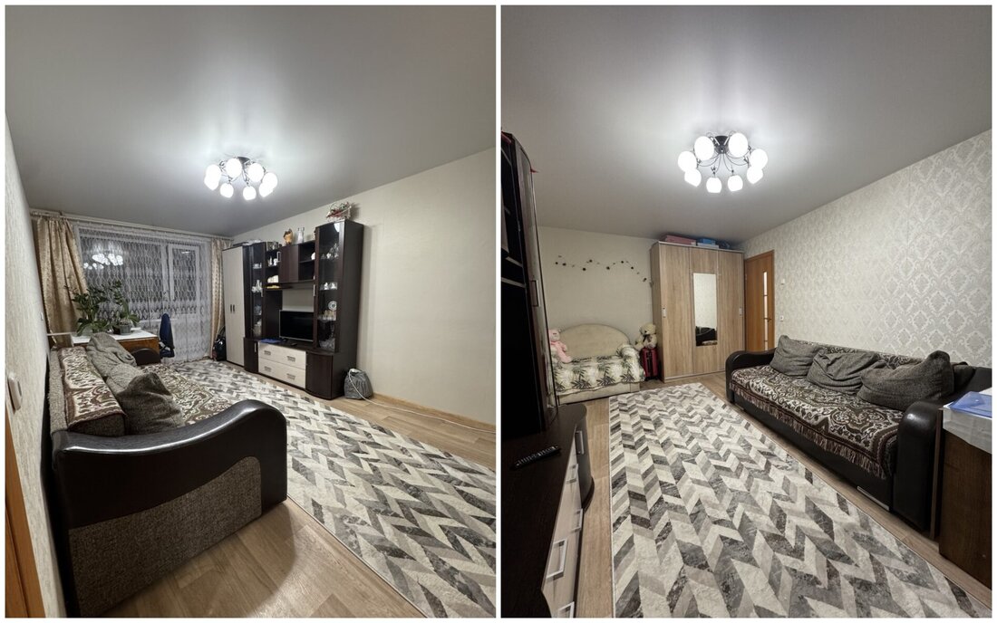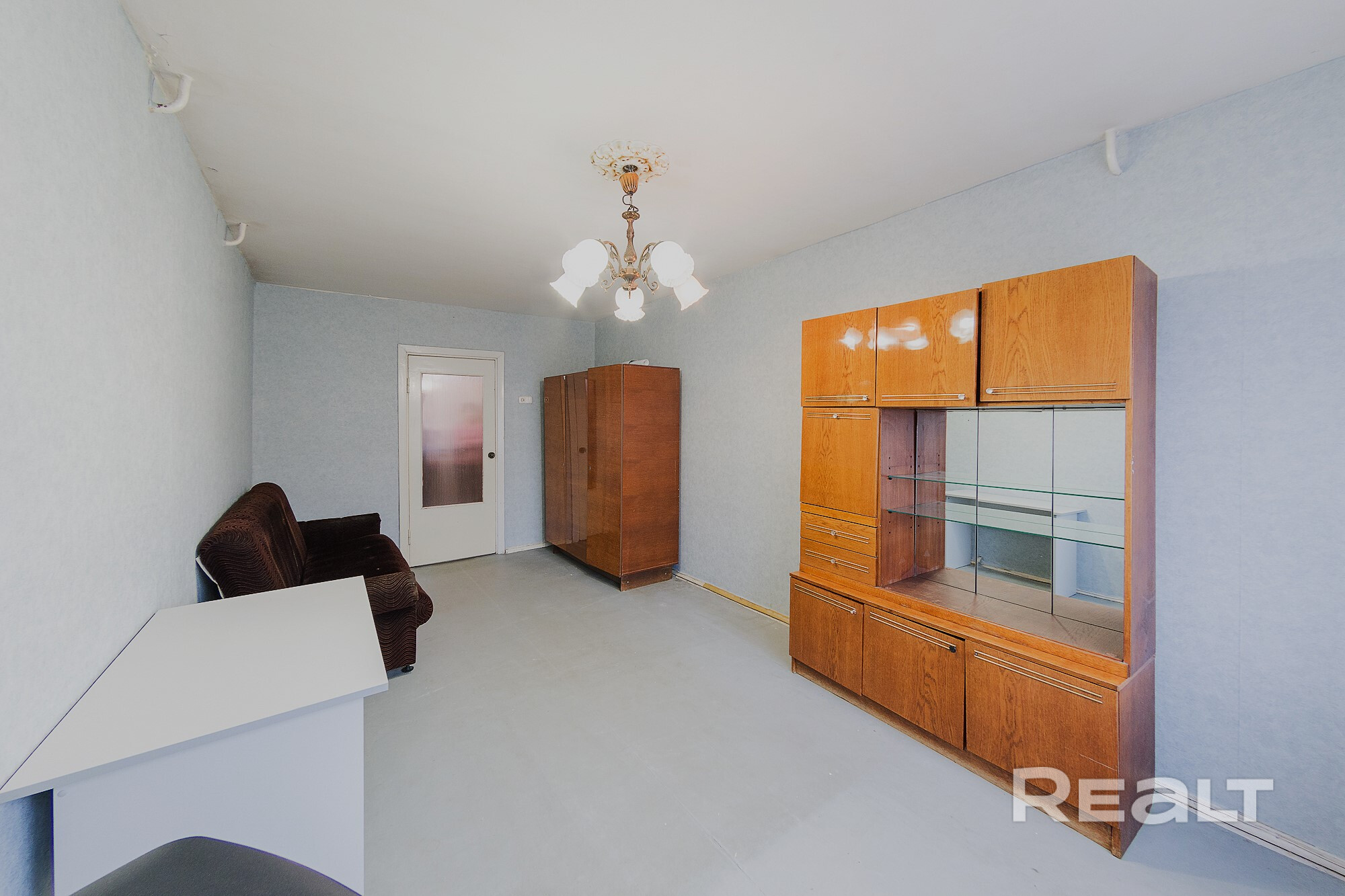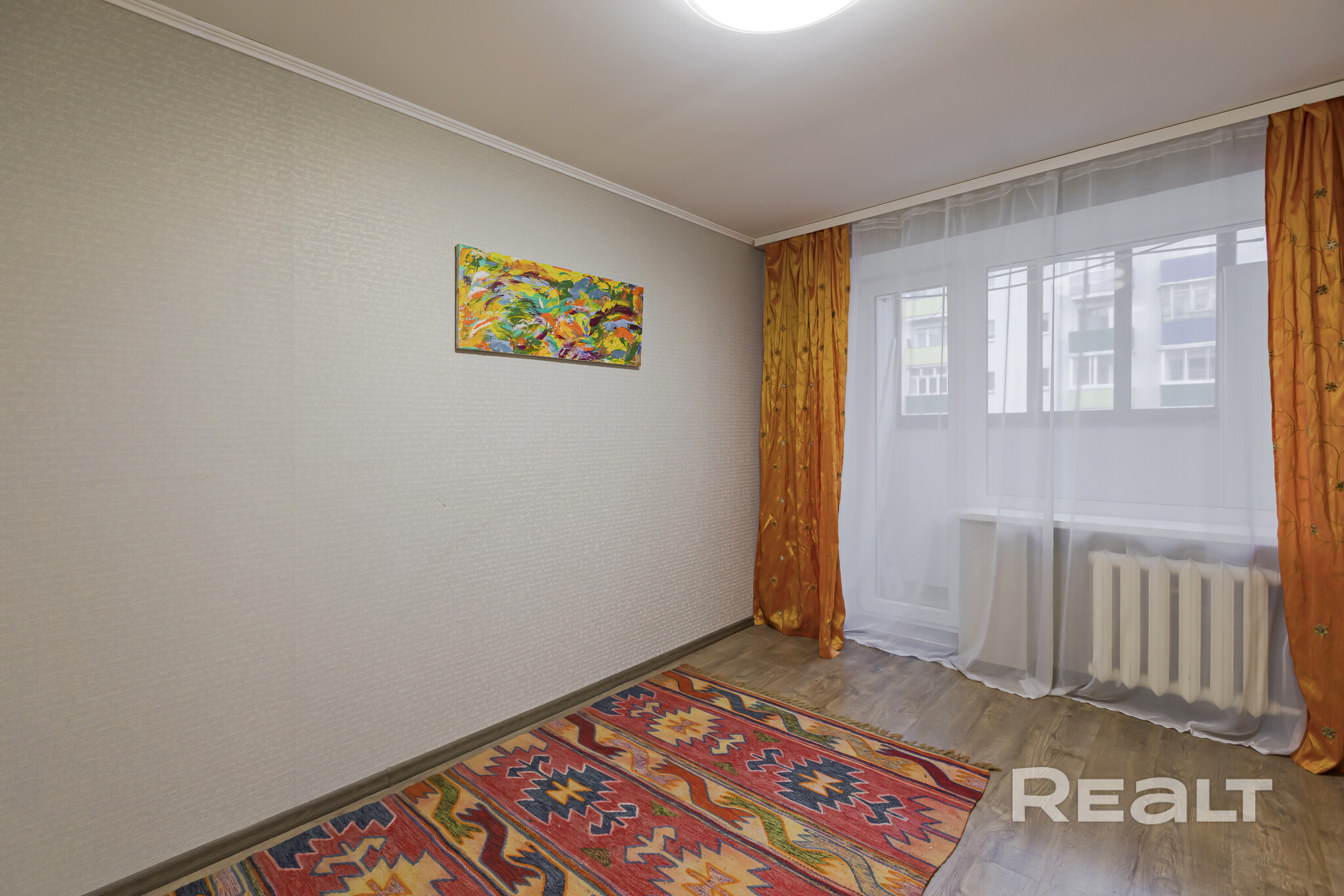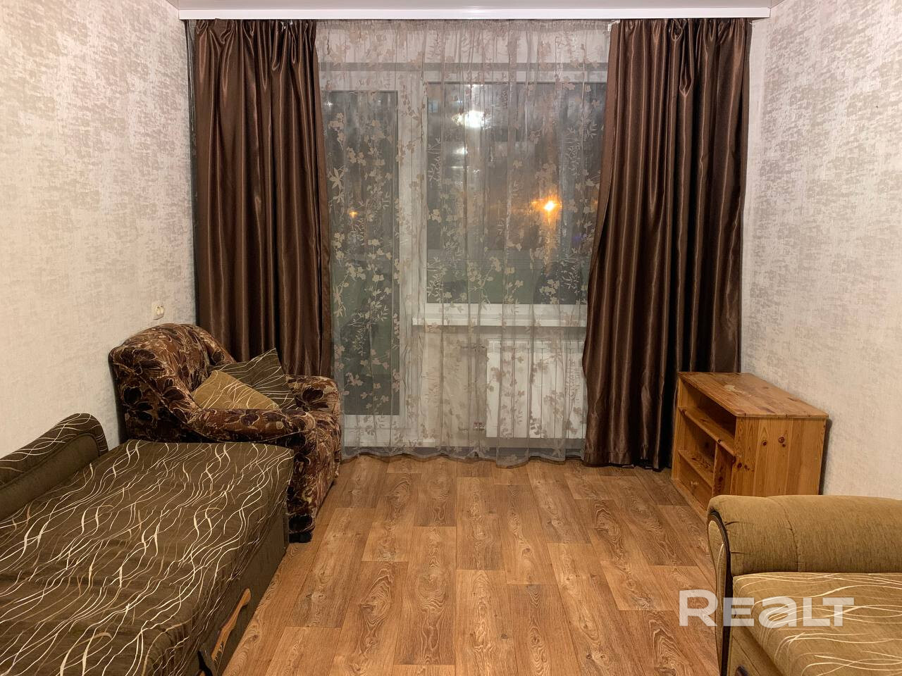 Квартира нуждается в обновлении. На полу лежит ламинат, в окнах стоят стеклопакеты. Жилье продается со всем, что есть на фото. Из комнаты имеется выход на застекленный балкон.