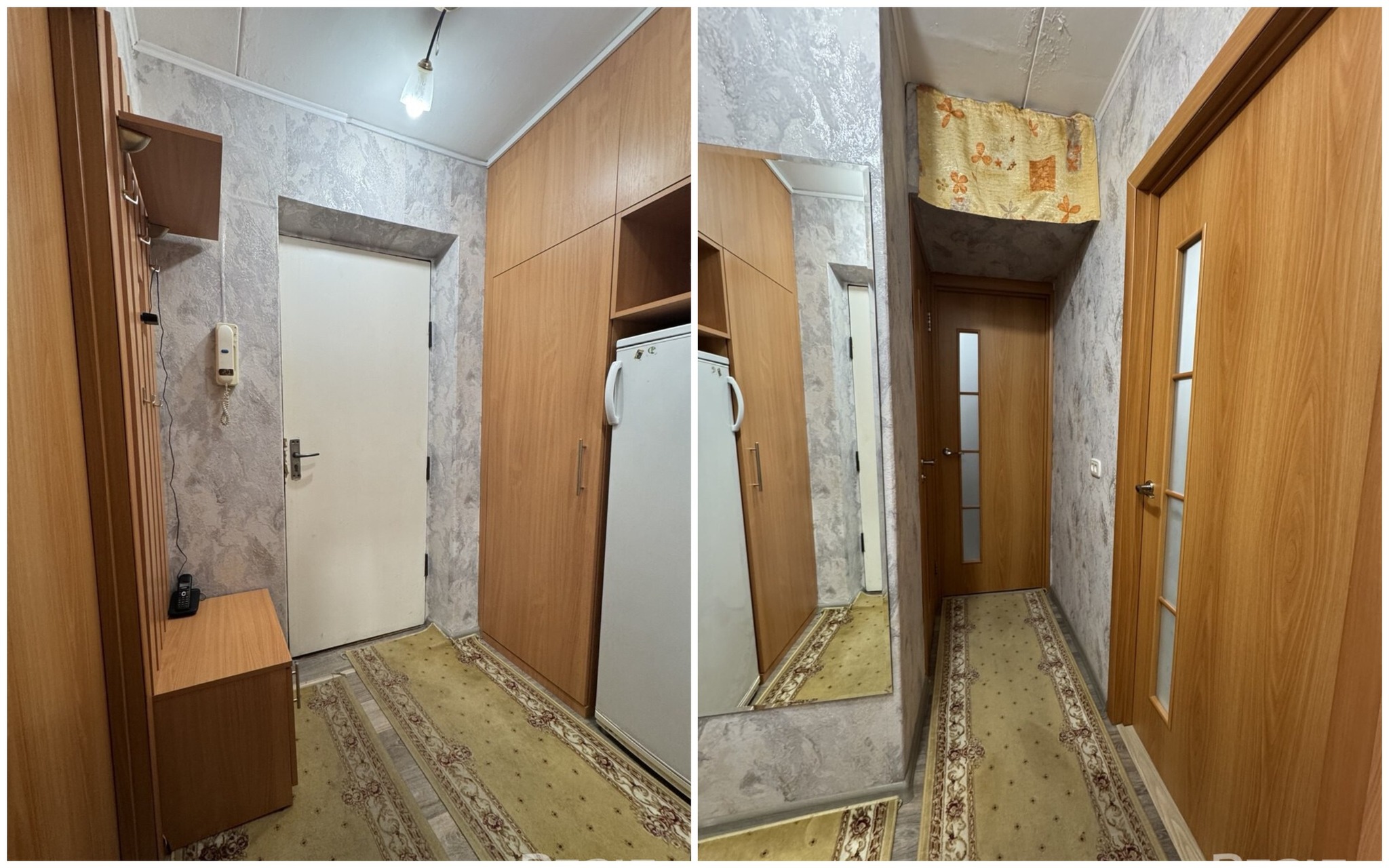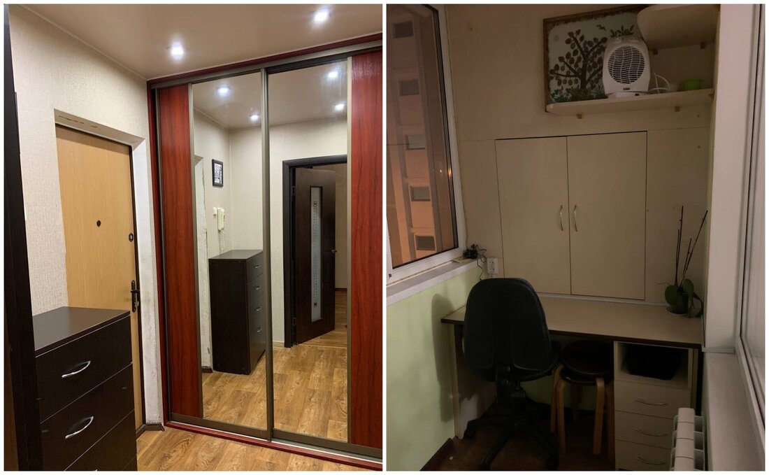 Квартира также нуждается в обновлении. В окнах тут стоят стеклопакеты. В коридоре и комнате имеются встроенные шкафы.
