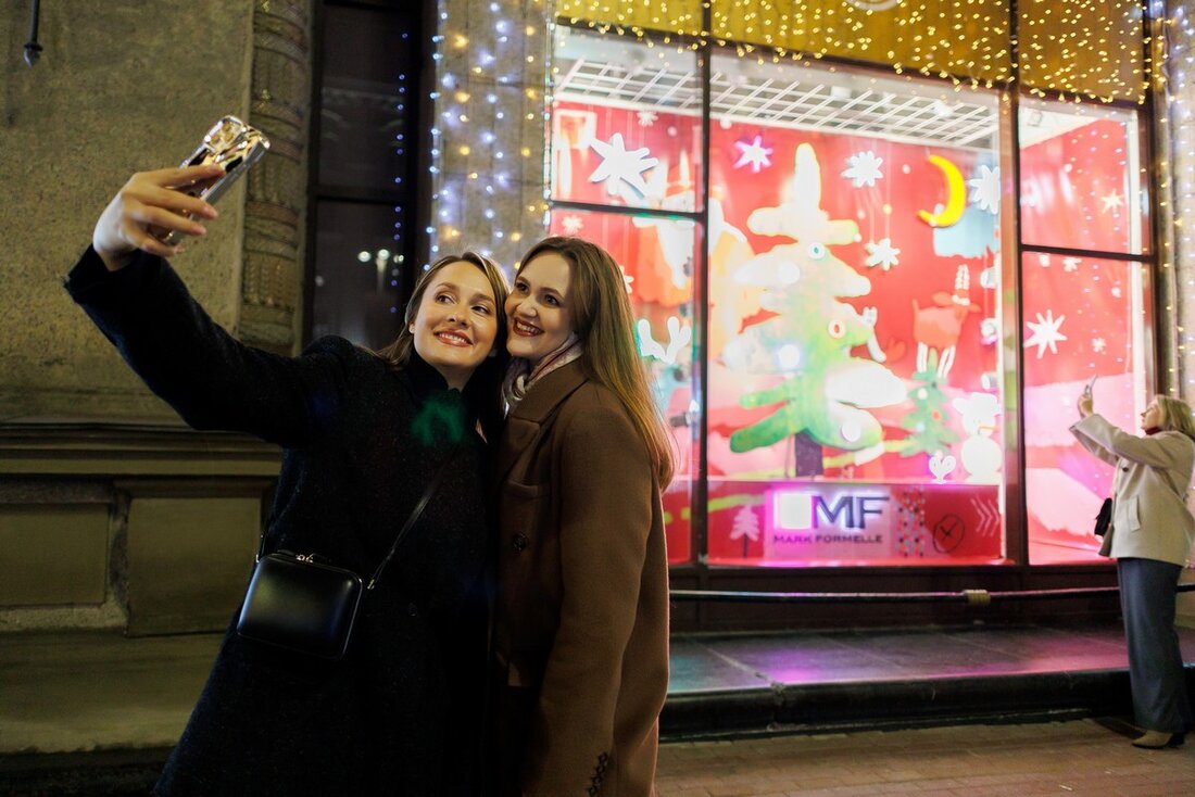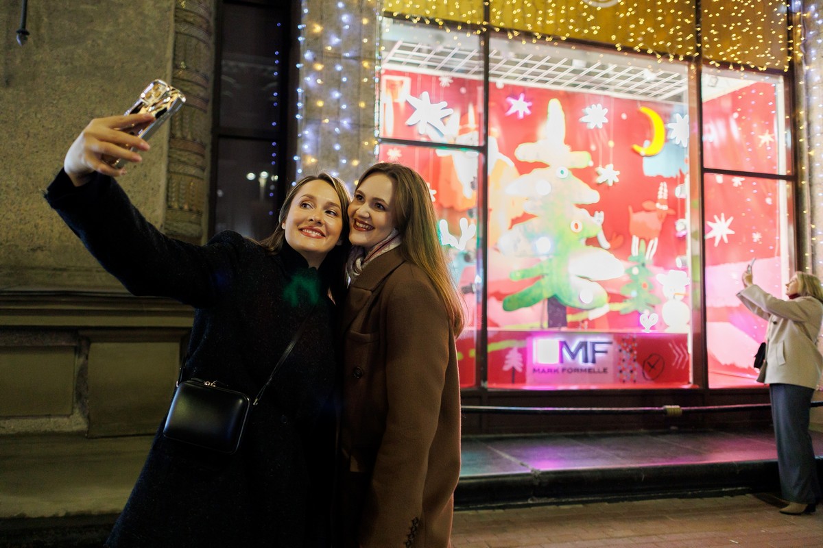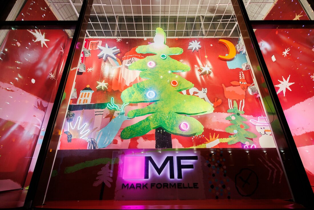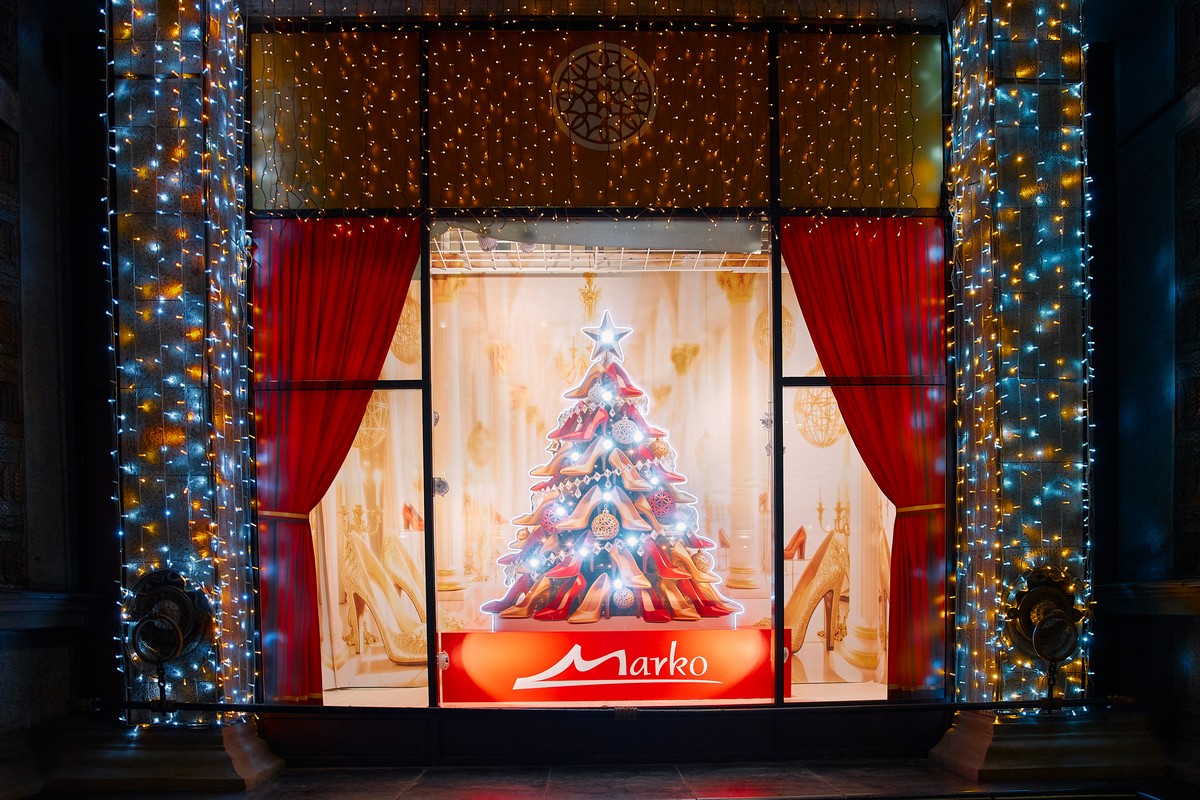 Одну из самых ярких витрин оформил Mark Formelle. В ее основу легла иллюстрация, созданная известным художником-примитивистом Ильей Кутобоем специально для модного бренда. В витрине можно увидеть новогодний пейзаж и персонажей — Деда Мороза, елку и лошадь — символ 2026 года. Ключевая идея работы — в погружении в мир ярких красок, теплых оттенков и смелых форм.