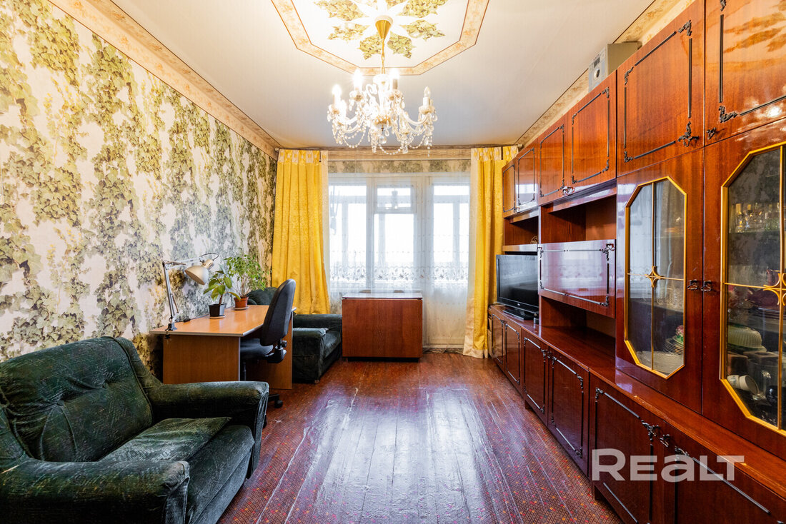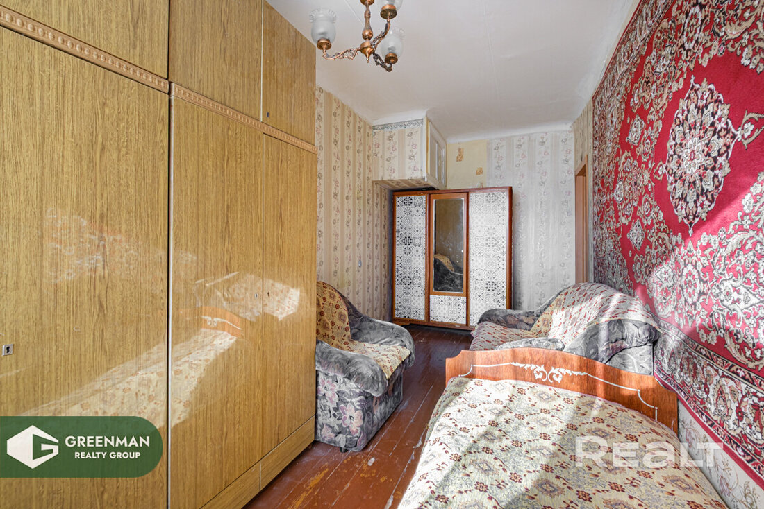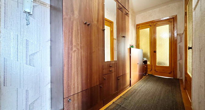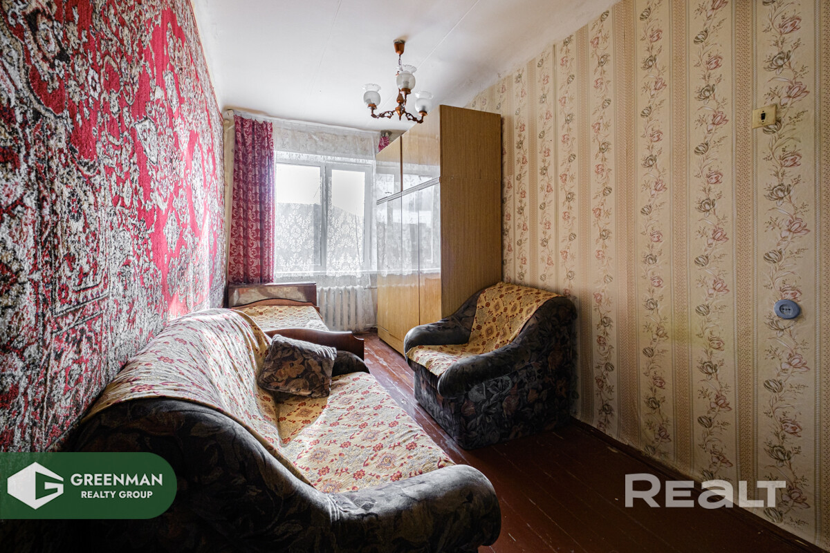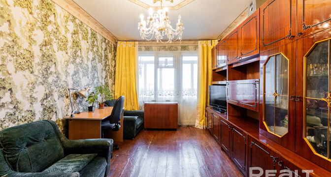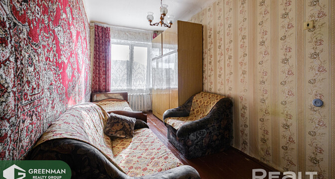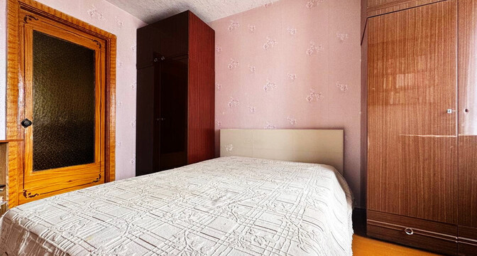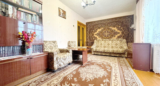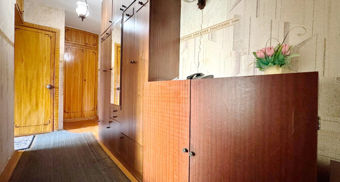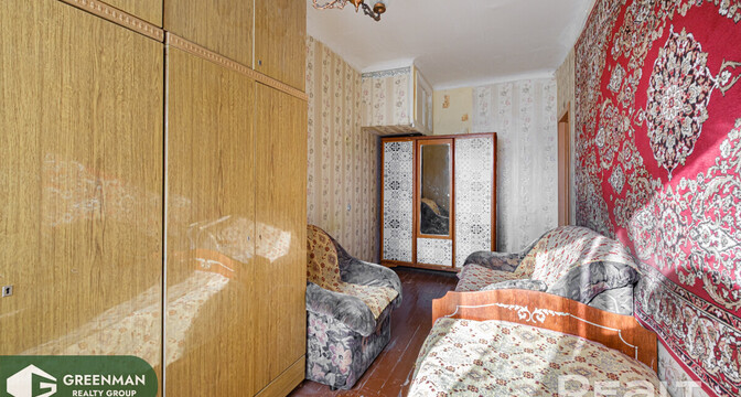 Здесь две изолированные комнаты. Есть балкон и кладовая. Квартира нуждается в обновлении. На полу лежат деревянные доски, оконные рамы тоже деревянные. После продажи остается мебель и техника.