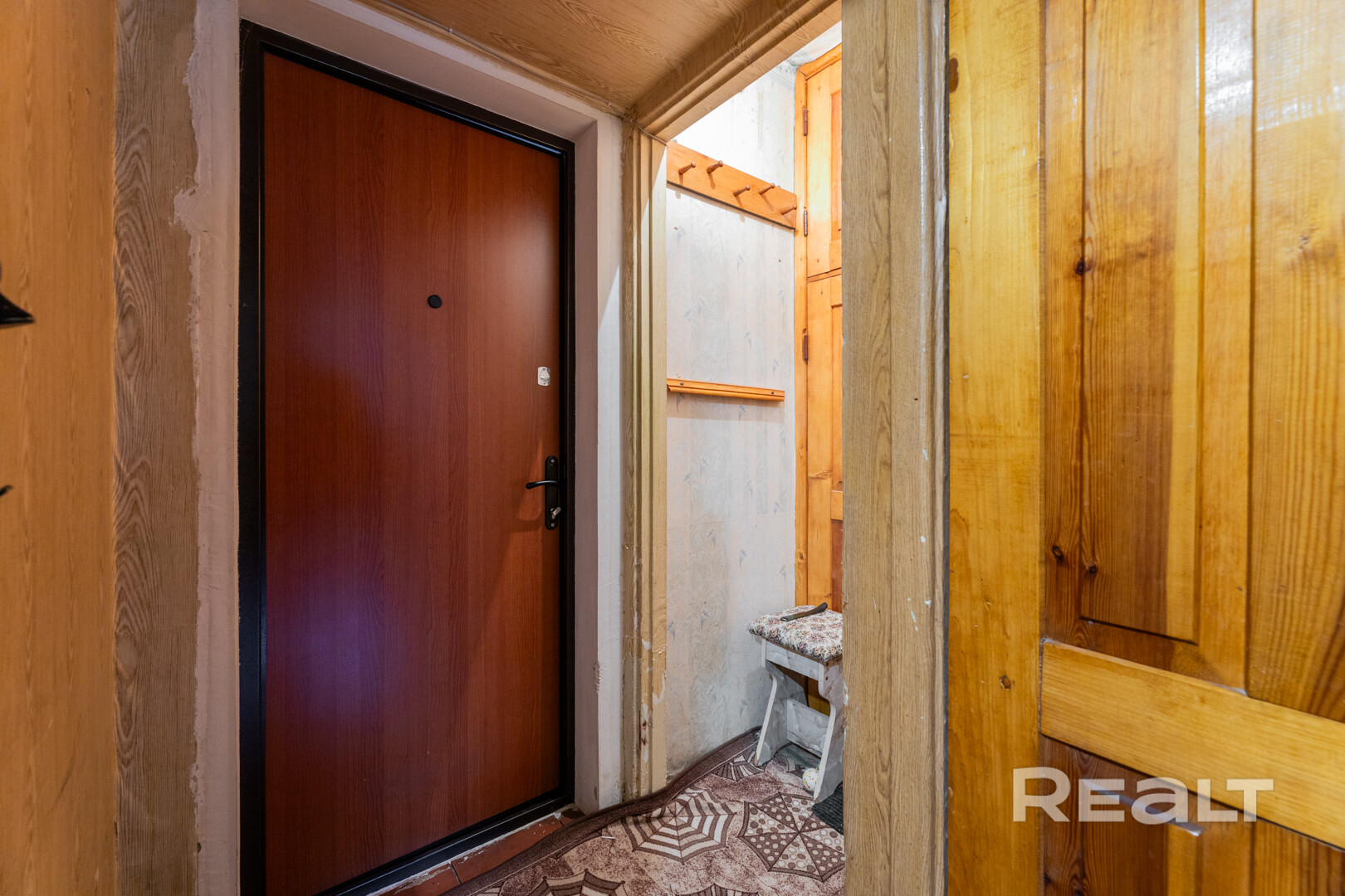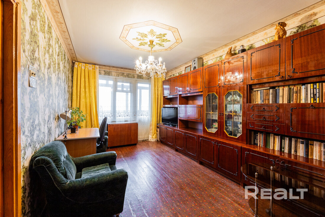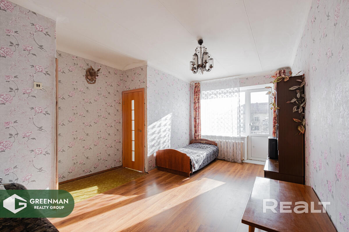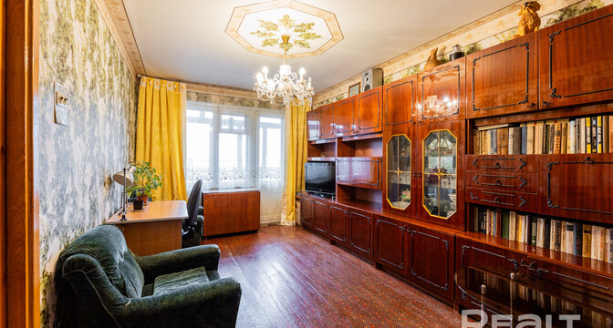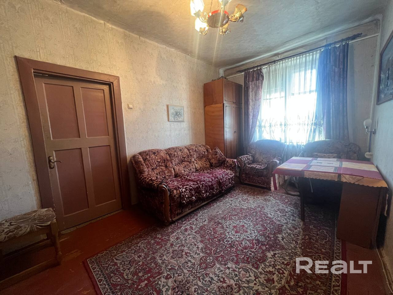 Здесь две изолированные комнаты. Есть балкон и кладовая. Квартира нуждается в обновлении. На полу лежат деревянные доски, оконные рамы тоже деревянные. После продажи остается мебель и техника.