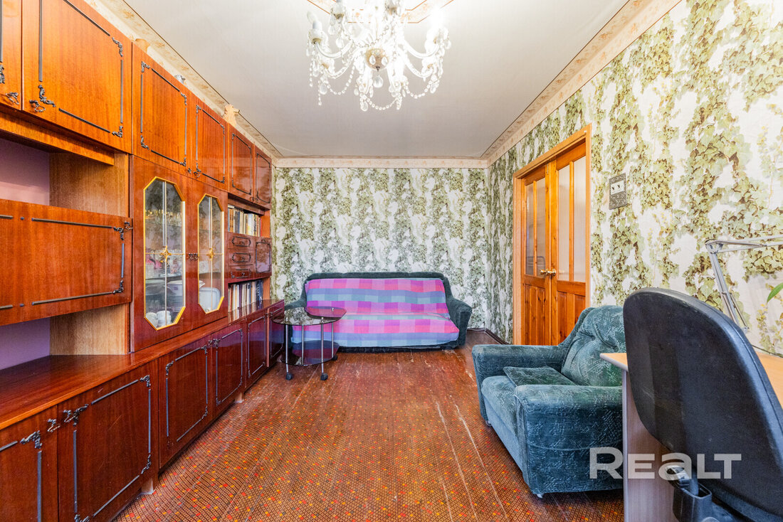Одна из комнат тут проходная. Здесь нет балкона и кладовых. Жилье нуждается в обновлении. На полу лежат деревянные доски.
