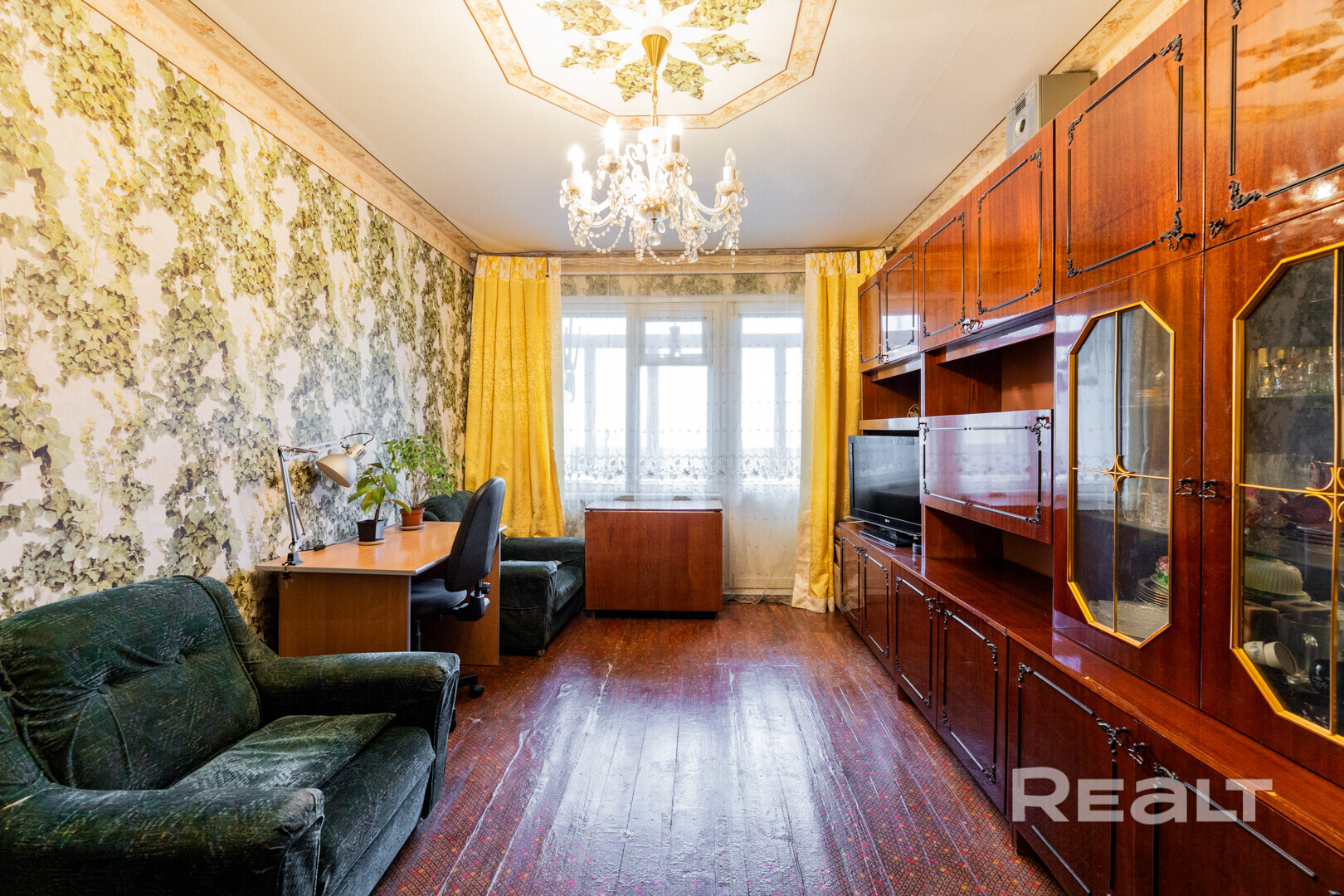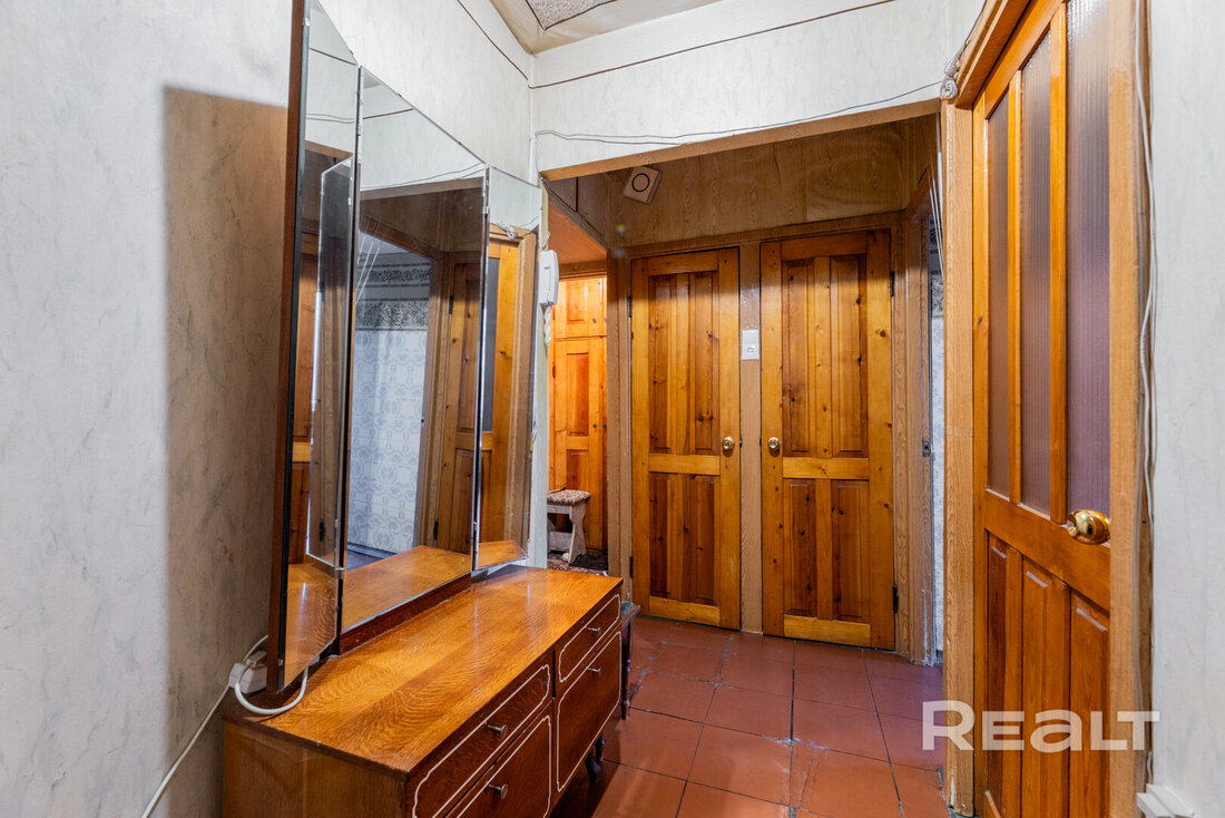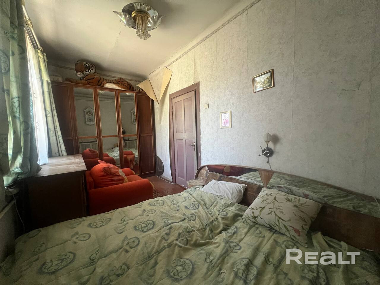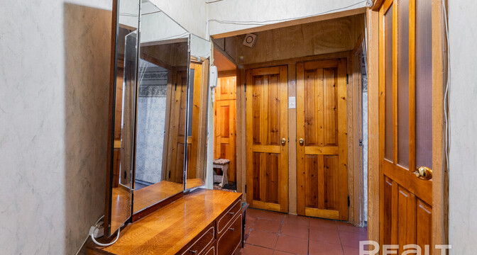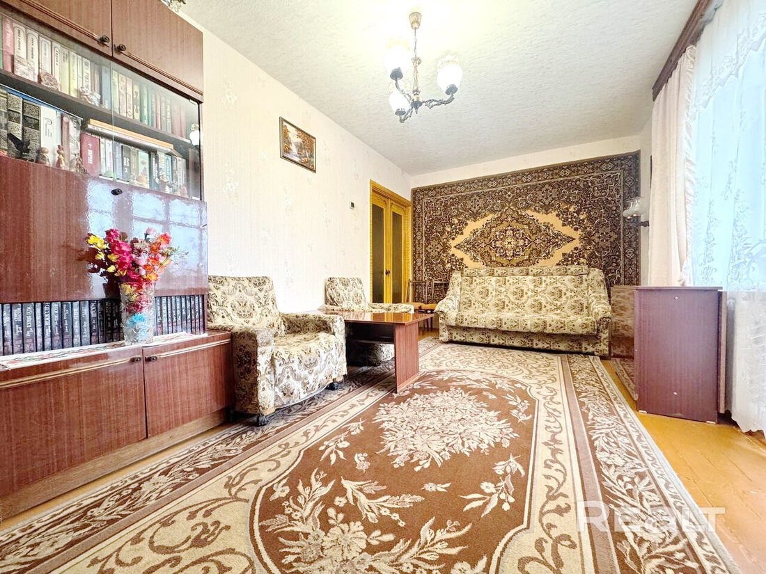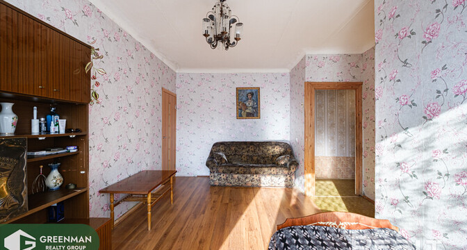 Жилье тоже нуждается в ремонте. В квартире заменены все окна, лежат деревянные полы. Одна из комнат — проходная. Из гостиной есть выход на балкон. Также имеется подвальное помещение.