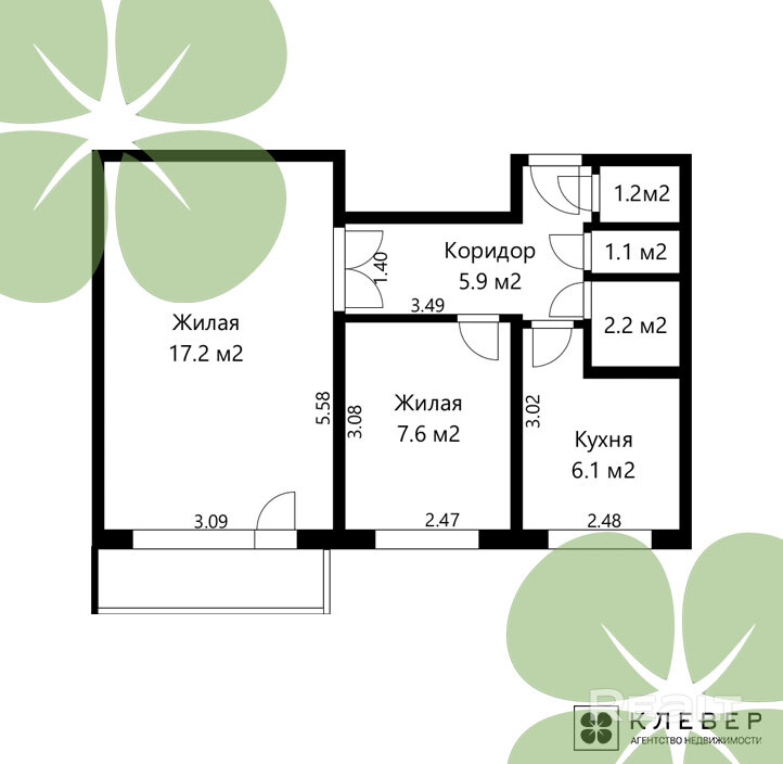 Квартира идет с двумя раздельными комнатами. В одной из них находится выход на большой балкон. В коридоре также имеются ниши для хранения вещей. Достанется покупателям и подвал.