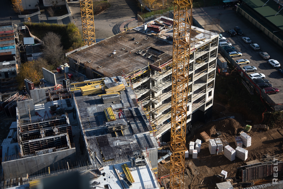 Первый дом планируют сдать в феврале 2026 года. Даже снаружи видно, что он практически готов — строители ведут фасадные работы. Второй дом активно растет, наружные стены его надземных частей заполняют блоками ячеистого бетона, блоками керамзитобетона, монолитными, со сплошным утеплением минераловатными плитами.