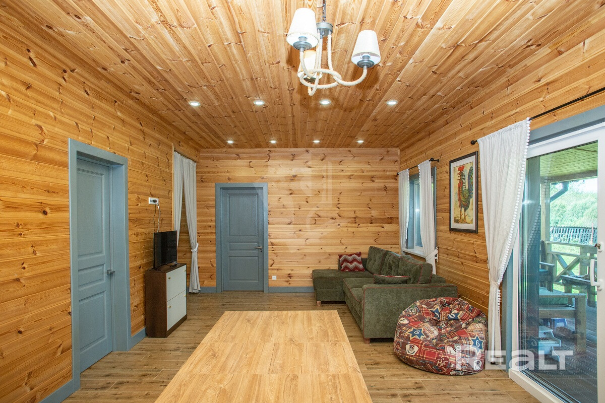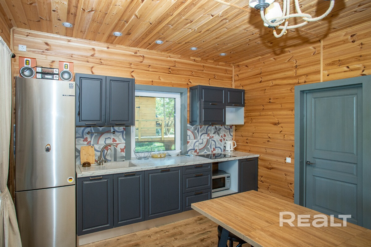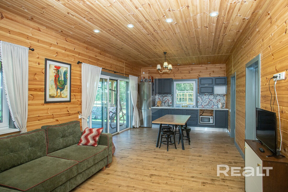 Внутри комнаты отделаны вагонкой. Одна из самых больших отведена на кухню-гостиную. Здесь есть мебель, установлена техника, которая частично отойдет новому владельцу.
