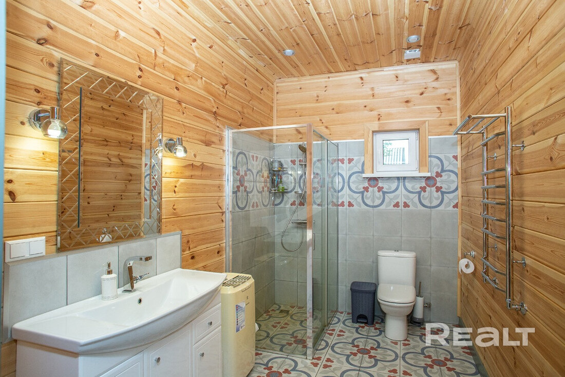 Позволяют жить круглый год введенные коммуникации: вода из скважины, канализация — септик, а также электрический котел. Санузел в доме совмещенный, с душевой кабиной.