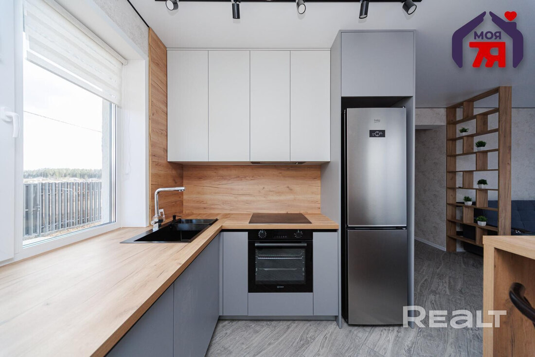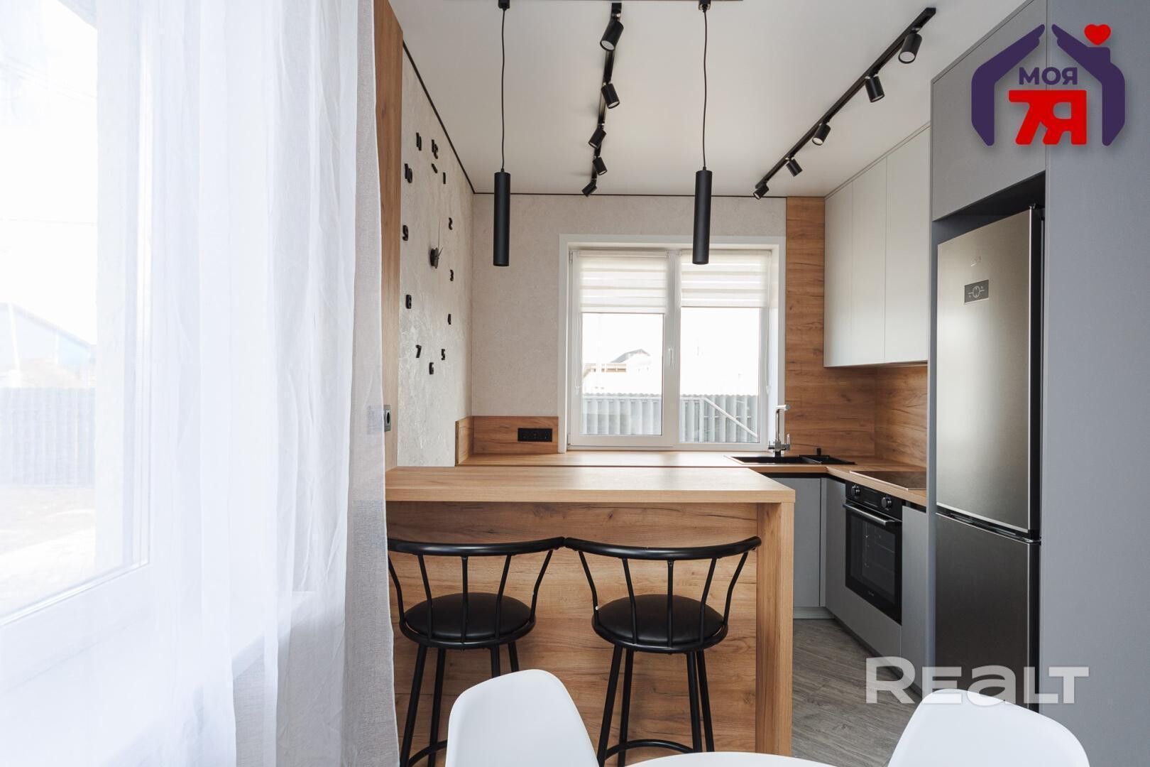 Внутри дачи — абсолютно новая отделка «под ключ». На кухне уже установлена кухонная мебель и техника. На фото можно заметить холодильник, духовой шкаф, варочную поверхность и вытяжку.