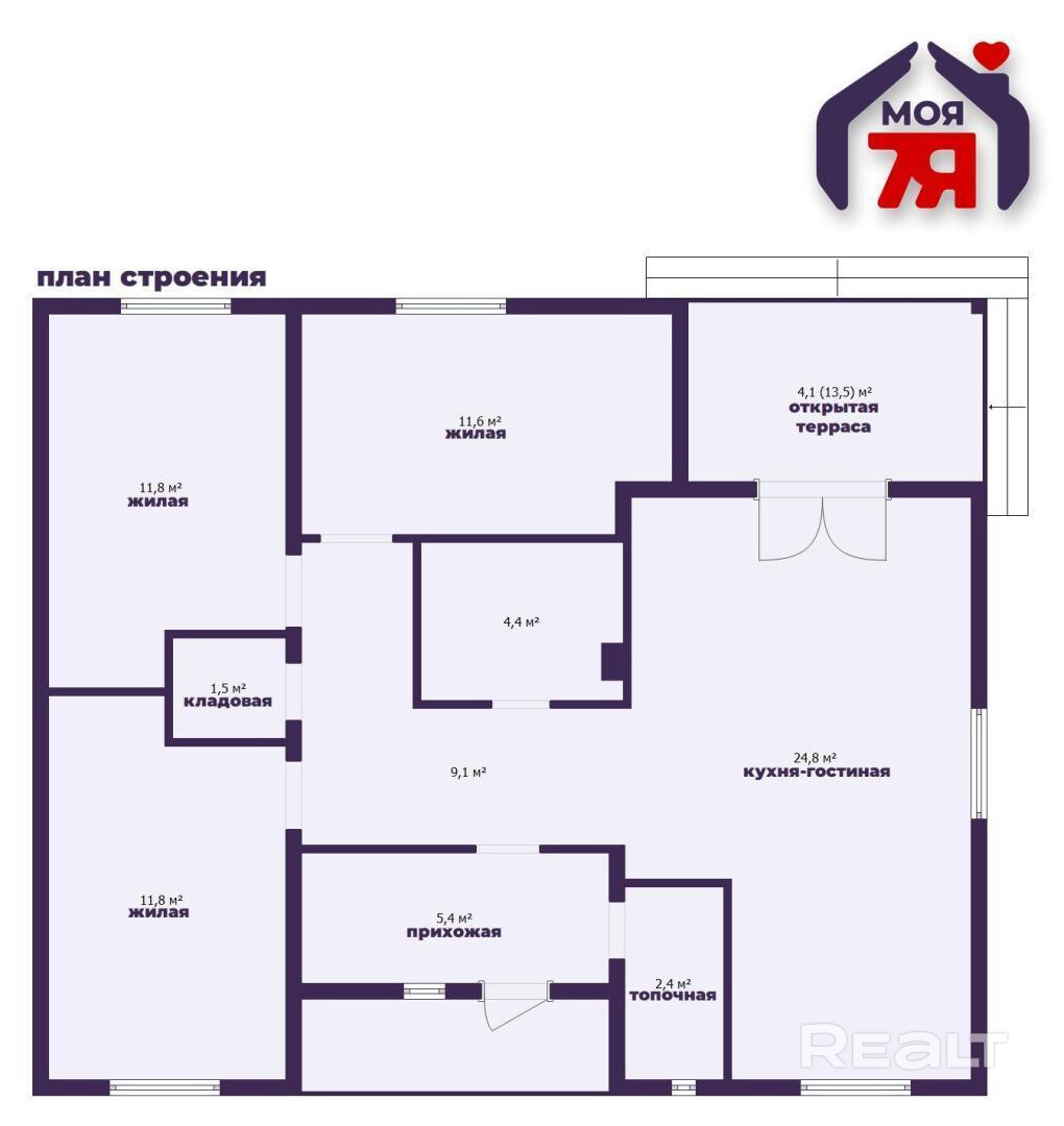 Одноэтажный коттедж прямоугольной формы насчитывает 86 квадратных метров общей площади. Дом состоит из кухни-гостиной (24 квадрата) с выходом на террасу, трех жилых комнат, гардеробной, топочной и санузла. В каждой из комнат предусмотрена система для хранения.