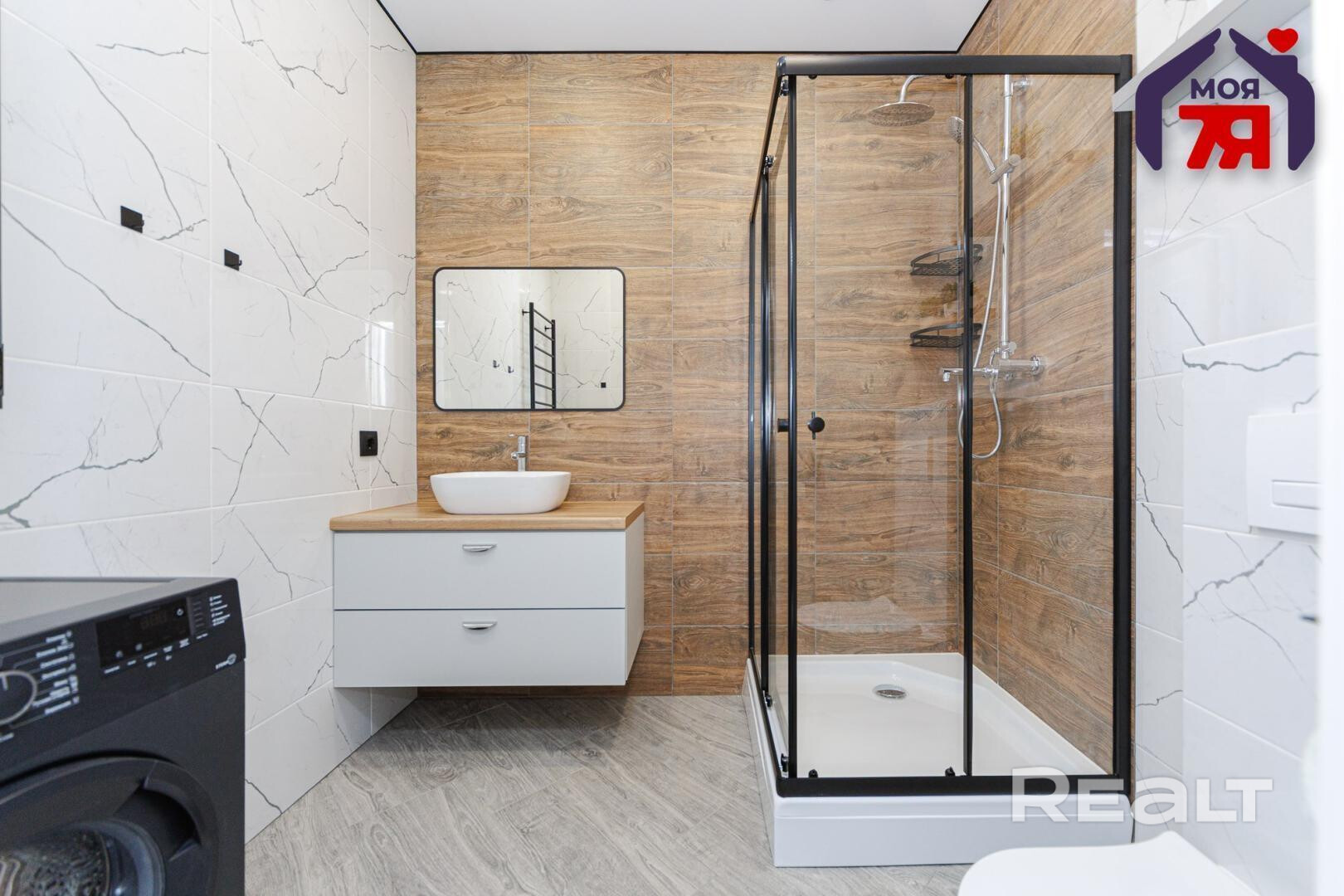 Санузел в доме — совмещенный, он облицован керамогранитом. Здесь есть вся сантехника, душ и стиральная машина.