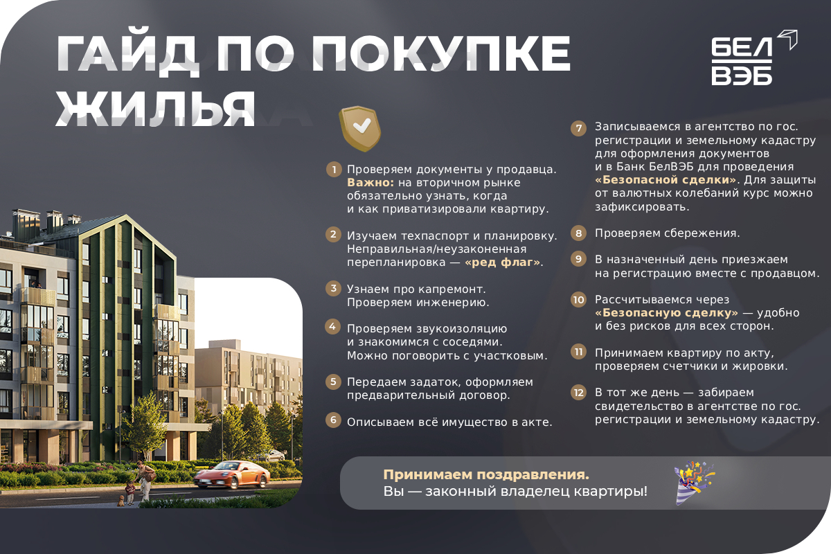 Покупка квартиры — это одновременно и радостное, и очень волнительное, событие. Для того, чтобы приобрести жилье своей мечты, многим из нас приходится экономить, копить, работать на нескольких работах. Учитывая всё вышеперечисленное, конечно, хочется, чтобы процесс покупки недвижимости прошел быстро и безопасно. Вместе с Банком БелВЭБ, который предлагает услугу «Безопасная сделка» для комфортных расчетов, мы решили составить чек-лист по покупке квартиры. Помог нам специалист с 10-летним опытом работы в агентстве недвижимости «Эксперт» — риэлтер Олег Муравский.