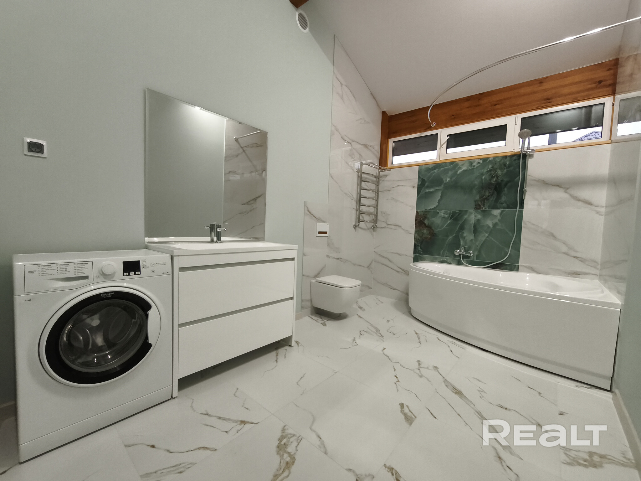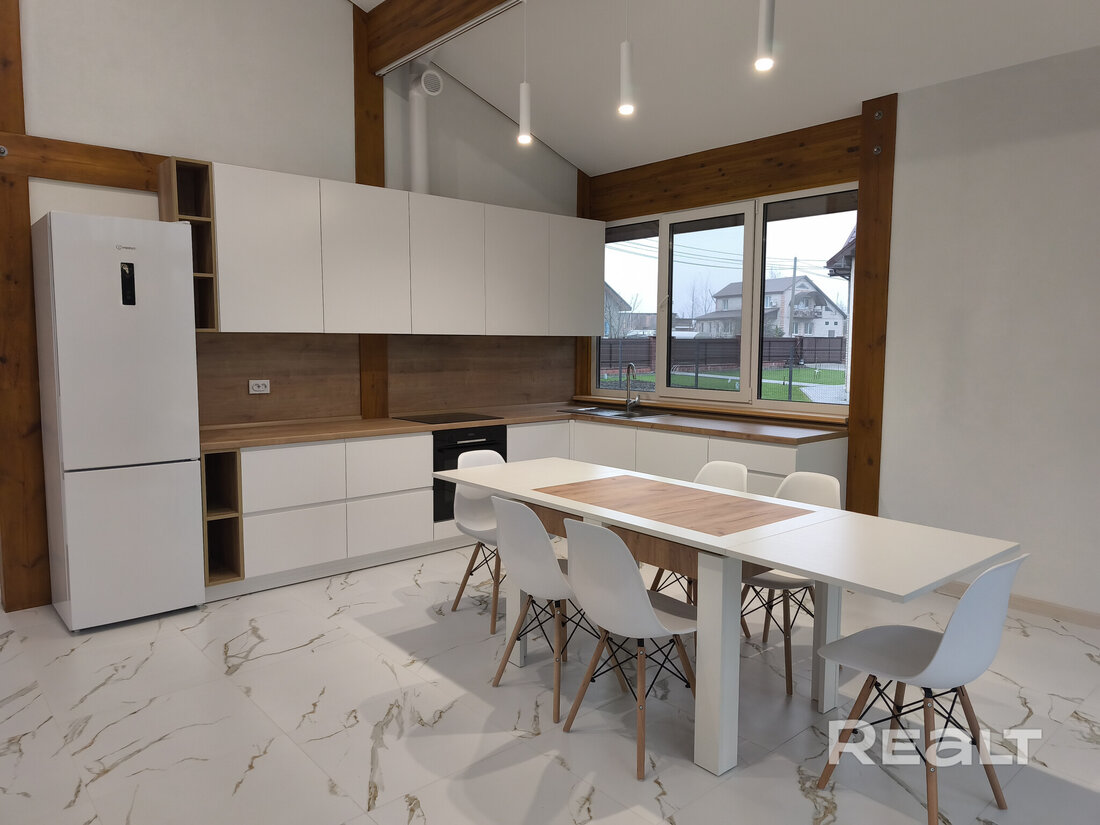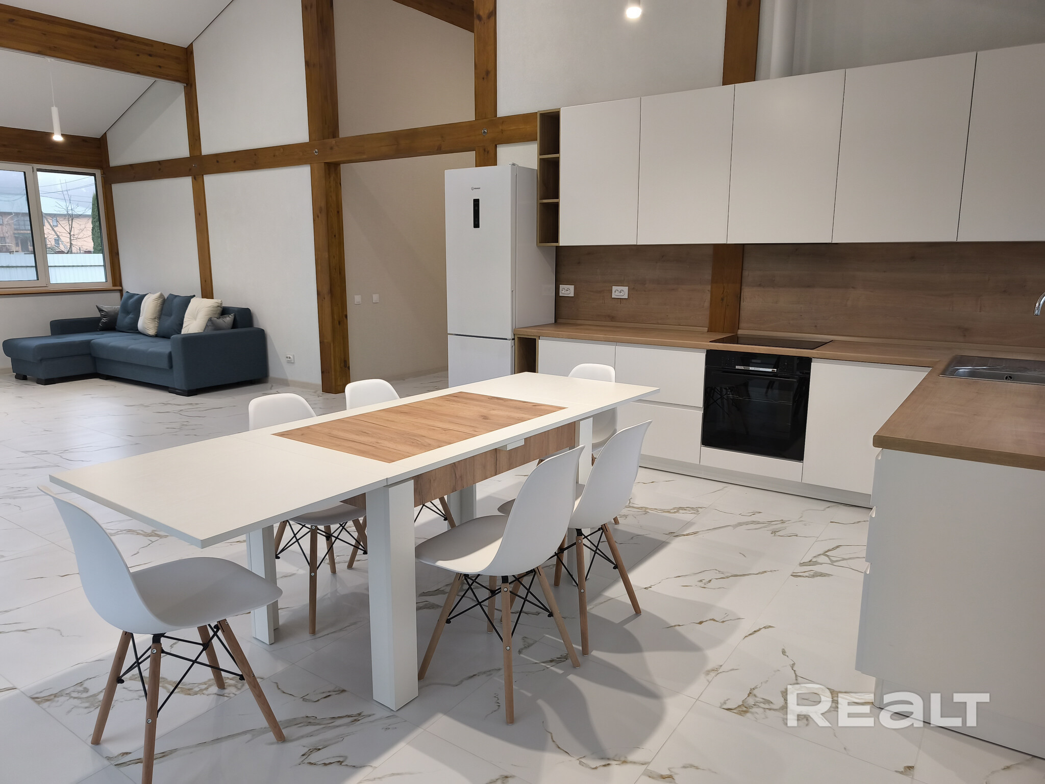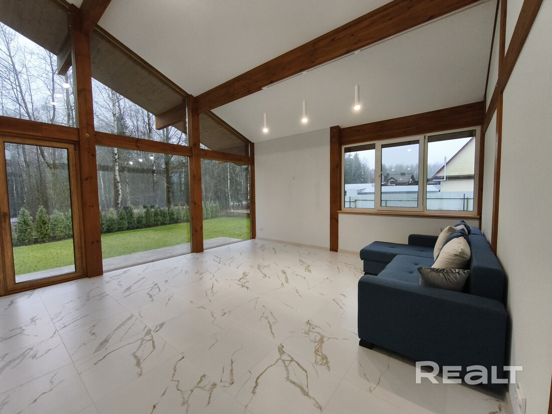 В доме — большие окна и высокие потолки (до 4,5 метра). Благодаря этому помещения всегда наполнены светом. Центром дома является просторная кухня-гостиная, в которой уже есть необходимое оборудование и техника. Другие помещения также имеют современную отделку и частично обставлены мебелью.
