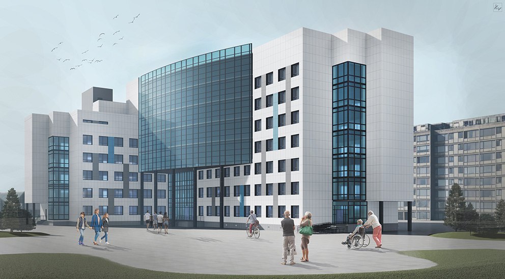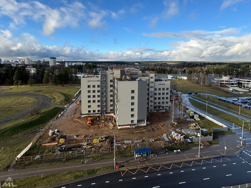 Поликлинику на 850 посещений строят в квартале проспекта Независимости — Героев 120-й дивизии — Курсанта Гвишиани — 50 лет Победы. Фасад практически готов. Осталось доделать парапетные крышки, примыкания к отмостке и небольшие фрагменты со стороны Рогачевской.