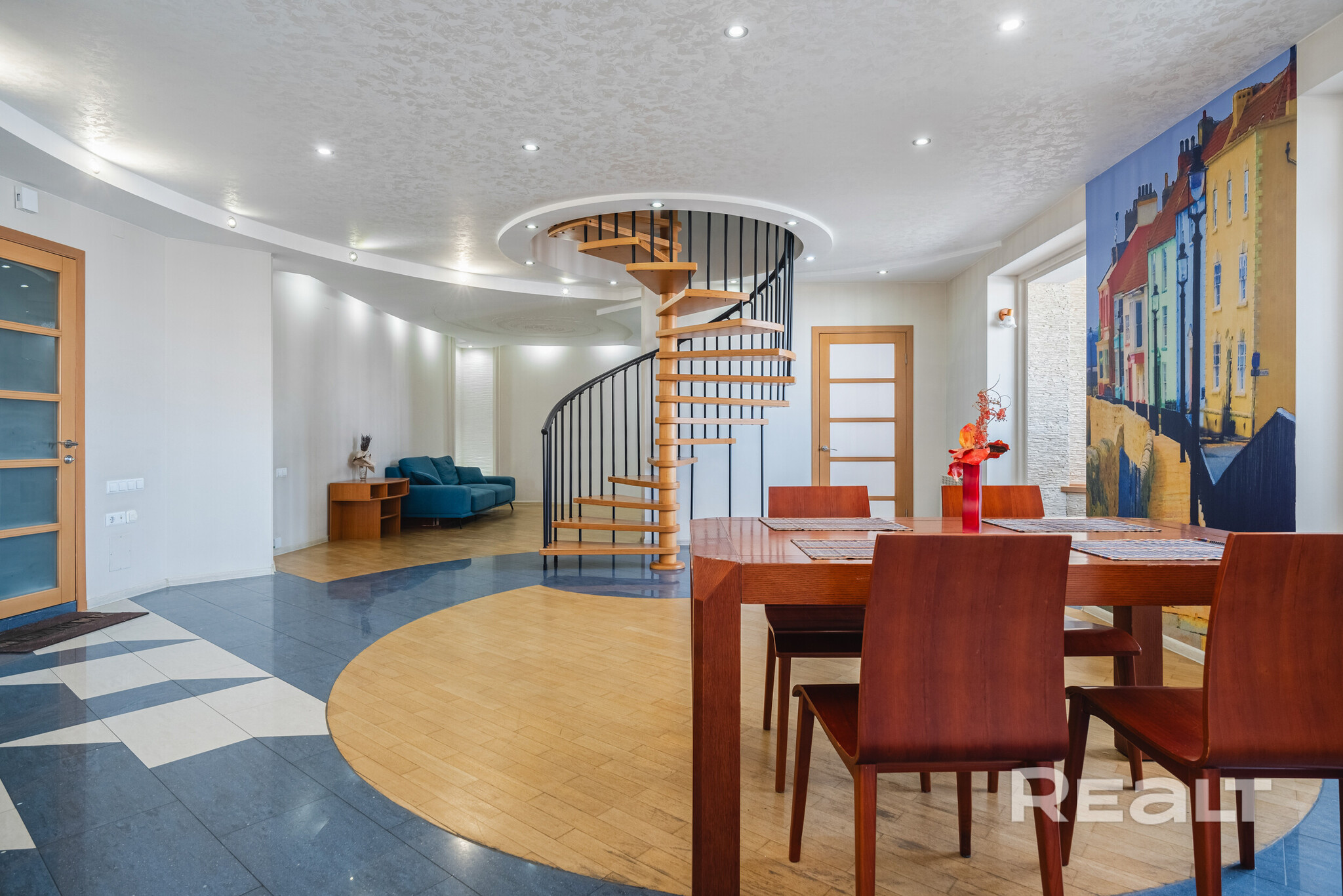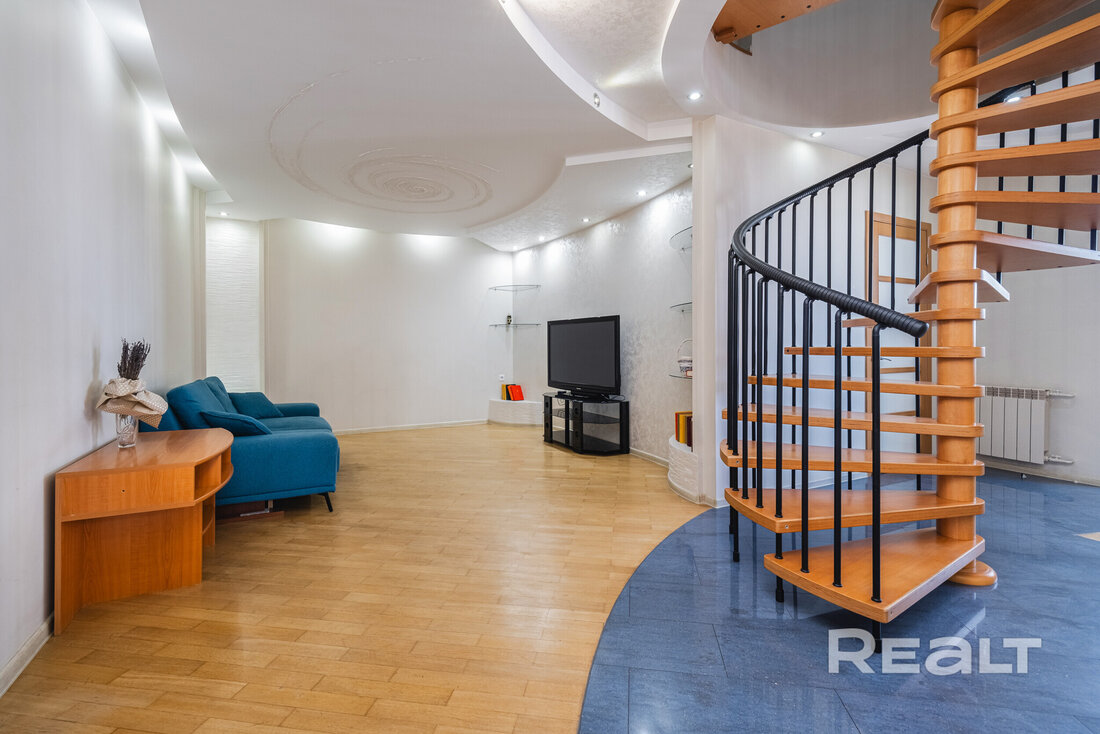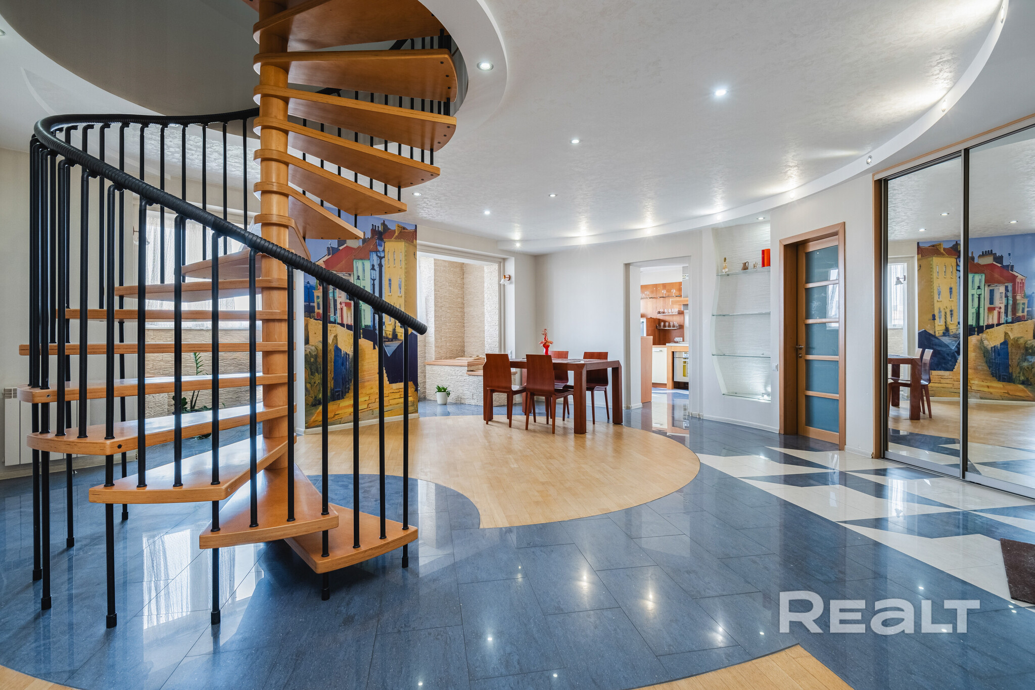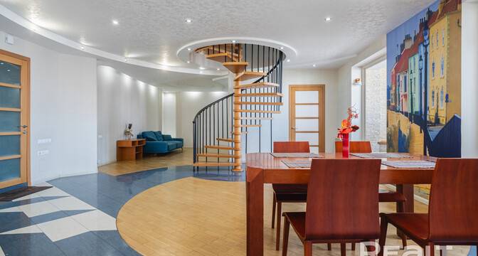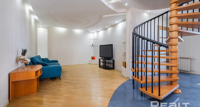 Еще одно предложение — эксклюзивная двухуровневая квартира общей площадью 170 квадратных метров. Располагается эта квартира, полностью готовая к проживанию, на 9−10 этажах. На первом уровне находится большая гостиная с несколькими выделенными зонами, кабинет и кухня; на втором — три спальни и гардеробная комната. В квартире предусмотрены также две большие лоджии и два санузла.