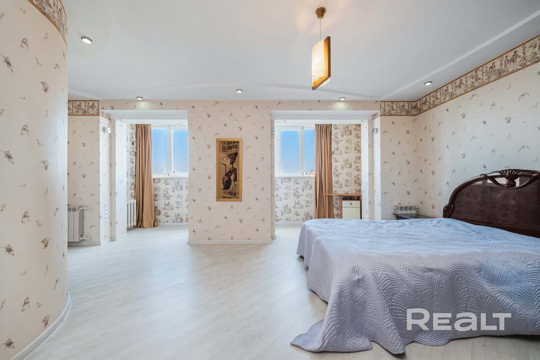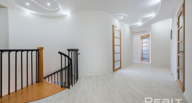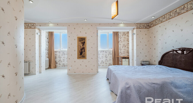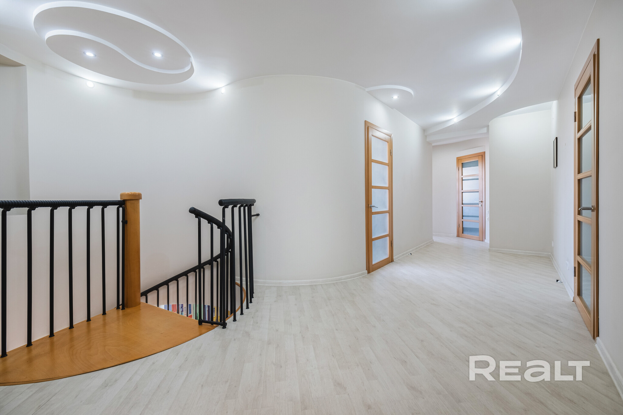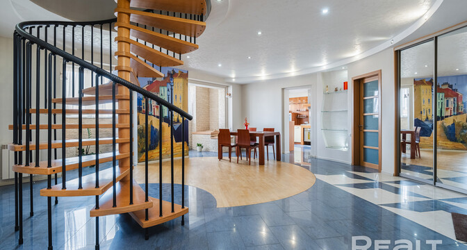 Еще одно предложение — эксклюзивная двухуровневая квартира общей площадью 170 квадратных метров. Располагается эта квартира, полностью готовая к проживанию, на 9−10 этажах. На первом уровне находится большая гостиная с несколькими выделенными зонами, кабинет и кухня; на втором — три спальни и гардеробная комната. В квартире предусмотрены также две большие лоджии и два санузла.