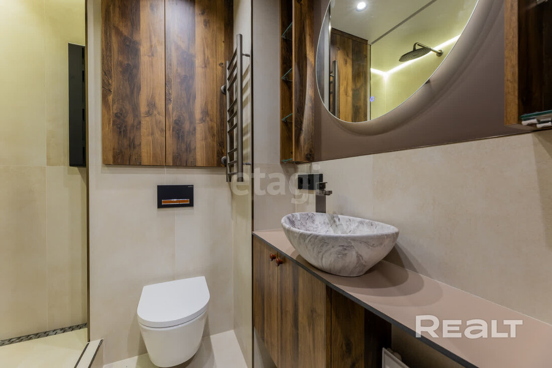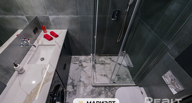 Освещение многоуровневое — трековые прожекторы, подвесные металлические лампы над обеденным столом и лаунж-зоной. Есть выход на застекленную лоджию. В совмещенном санузле пол и стены выполнены из текстурного керамогранита цвета сосновой хвои, а аксессуары — в единой отделке из нержавеющей стали. Установлена душевая кабина, подключена стиральная машина.