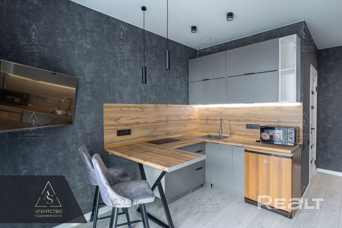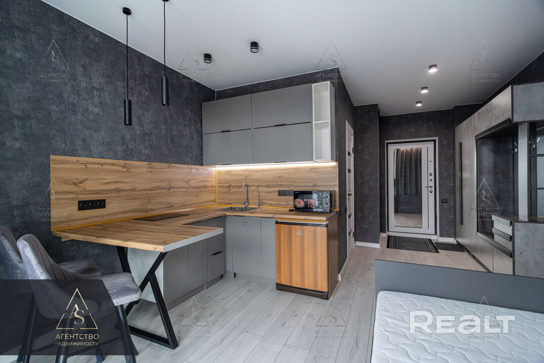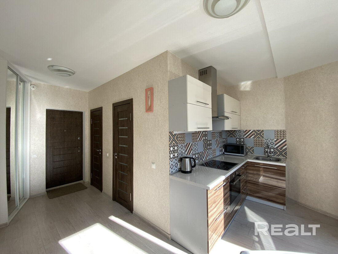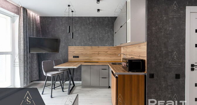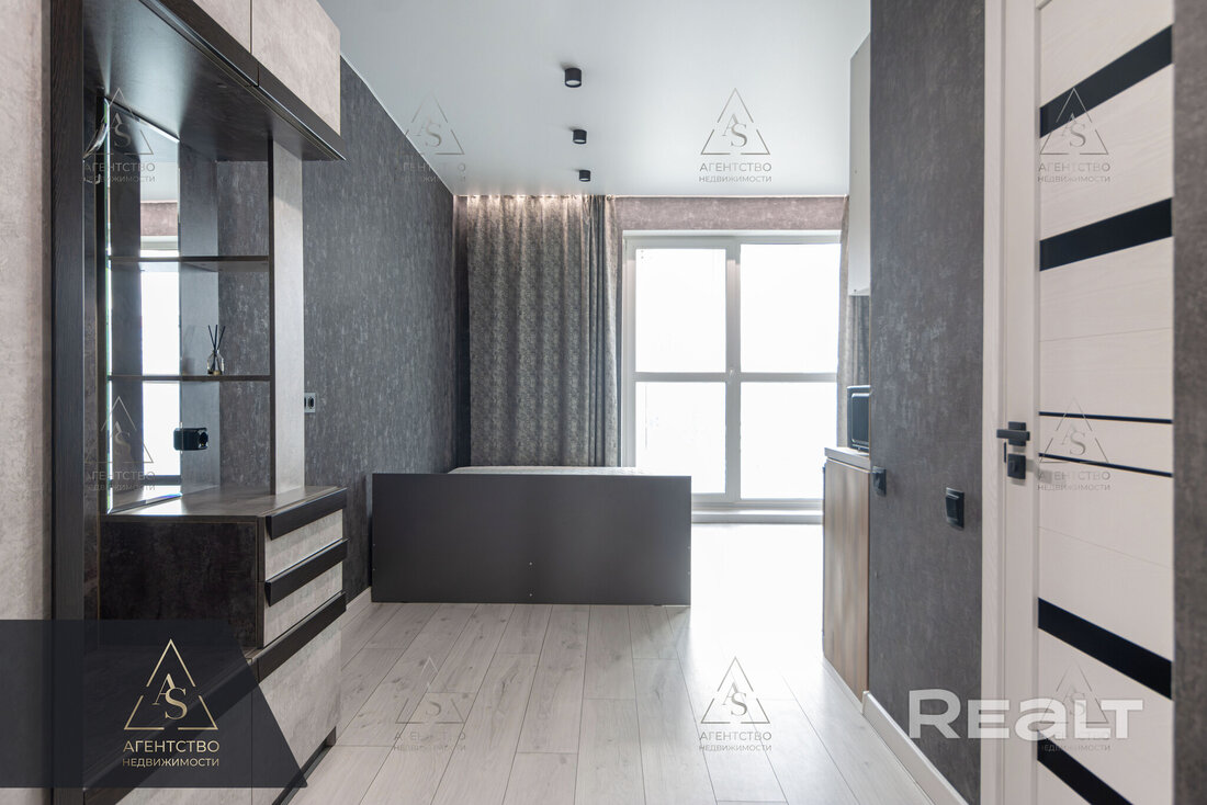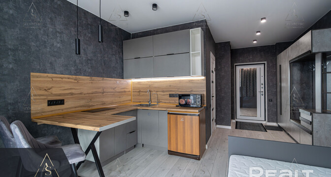 Еще один вариант из Минск-Мира, но с более брутальным ремонтом — студия по адресу Савицкого, 12. Это 16-этажный дом в квартале «Азия». До станции метро «Аэродромная» около пяти минут пешком.