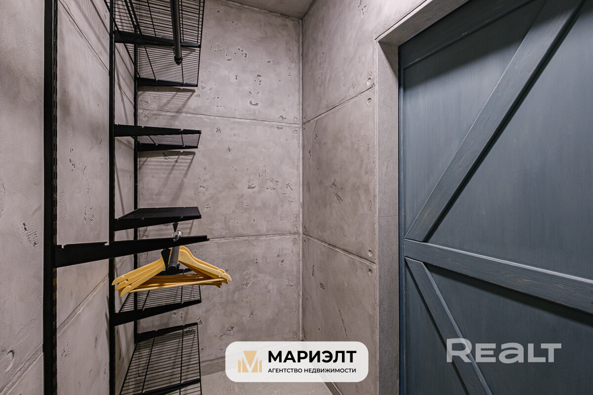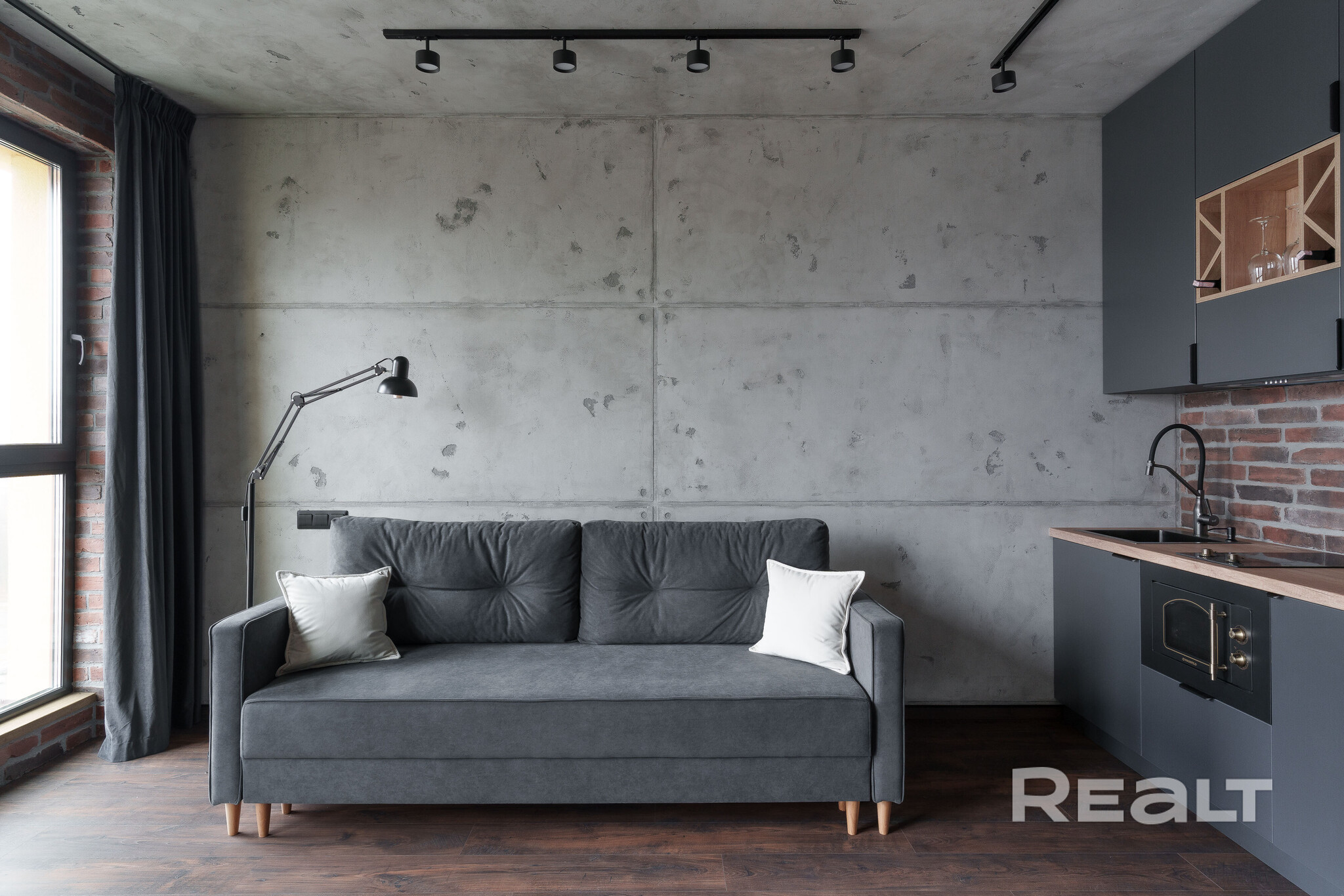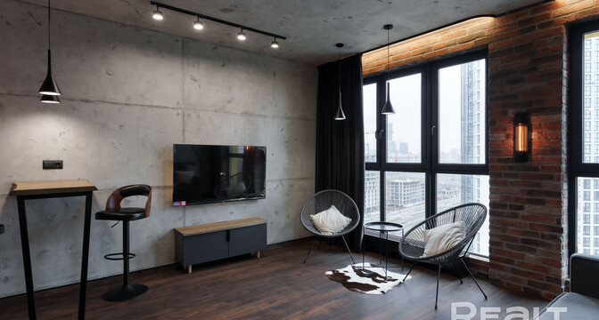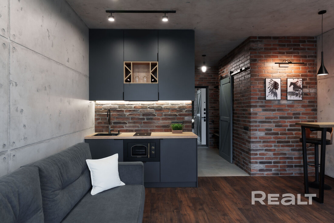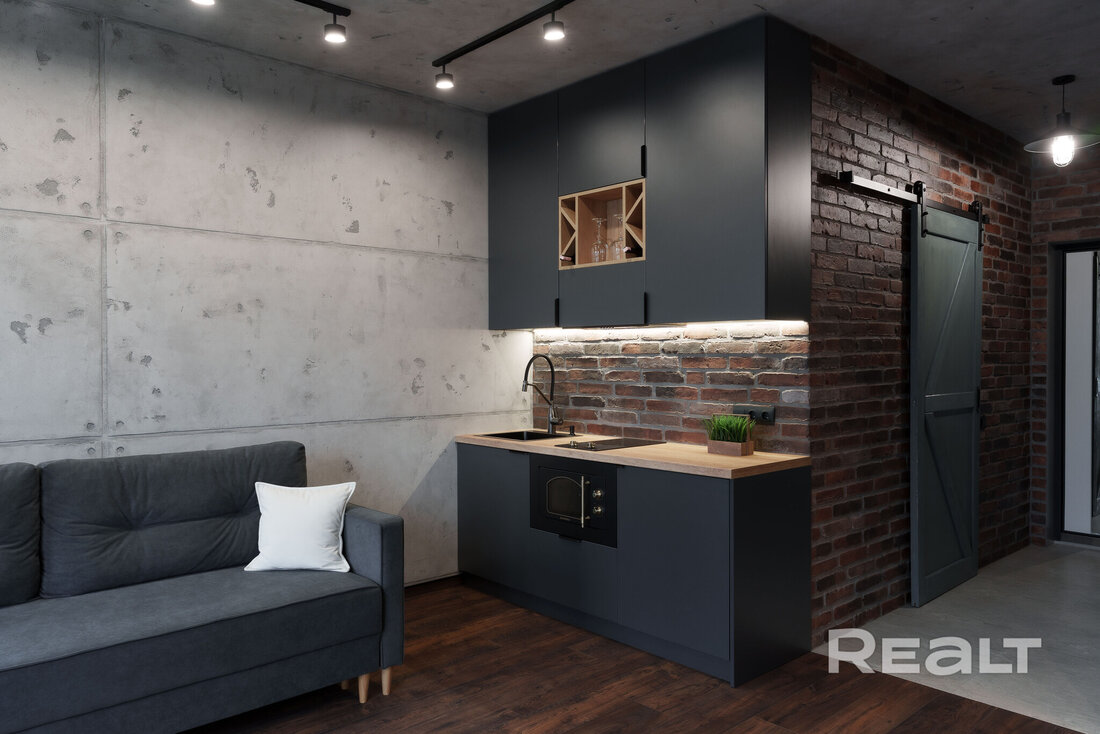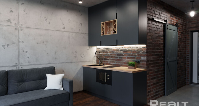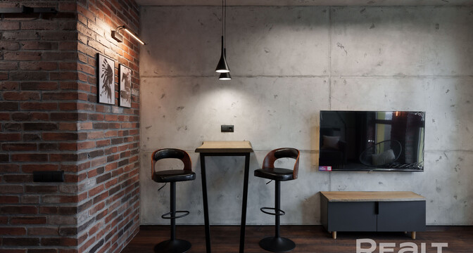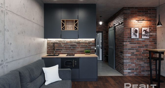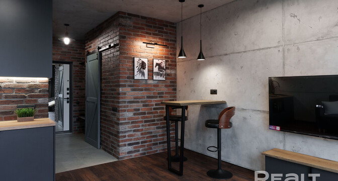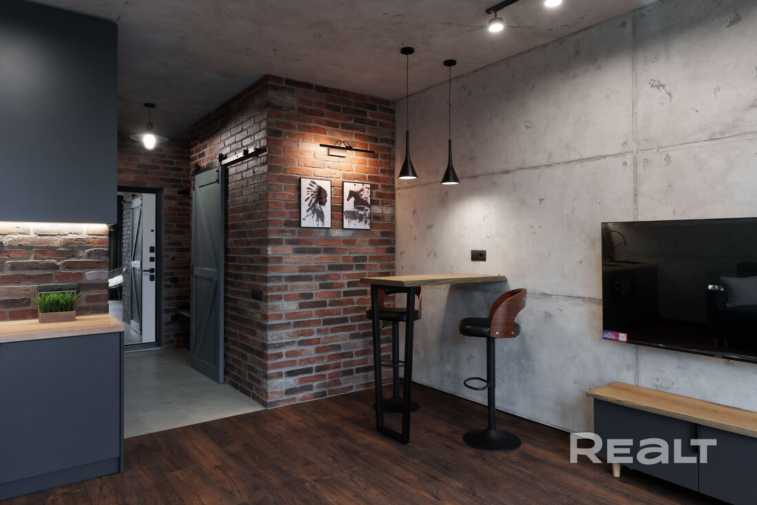 Студия расположена на 13-м этаже. Общий метраж — 30 квадратов. В квартире выполнен нестандартный ремонт. Установлены амбарные двери, на стенах штукатурка с фактурой.