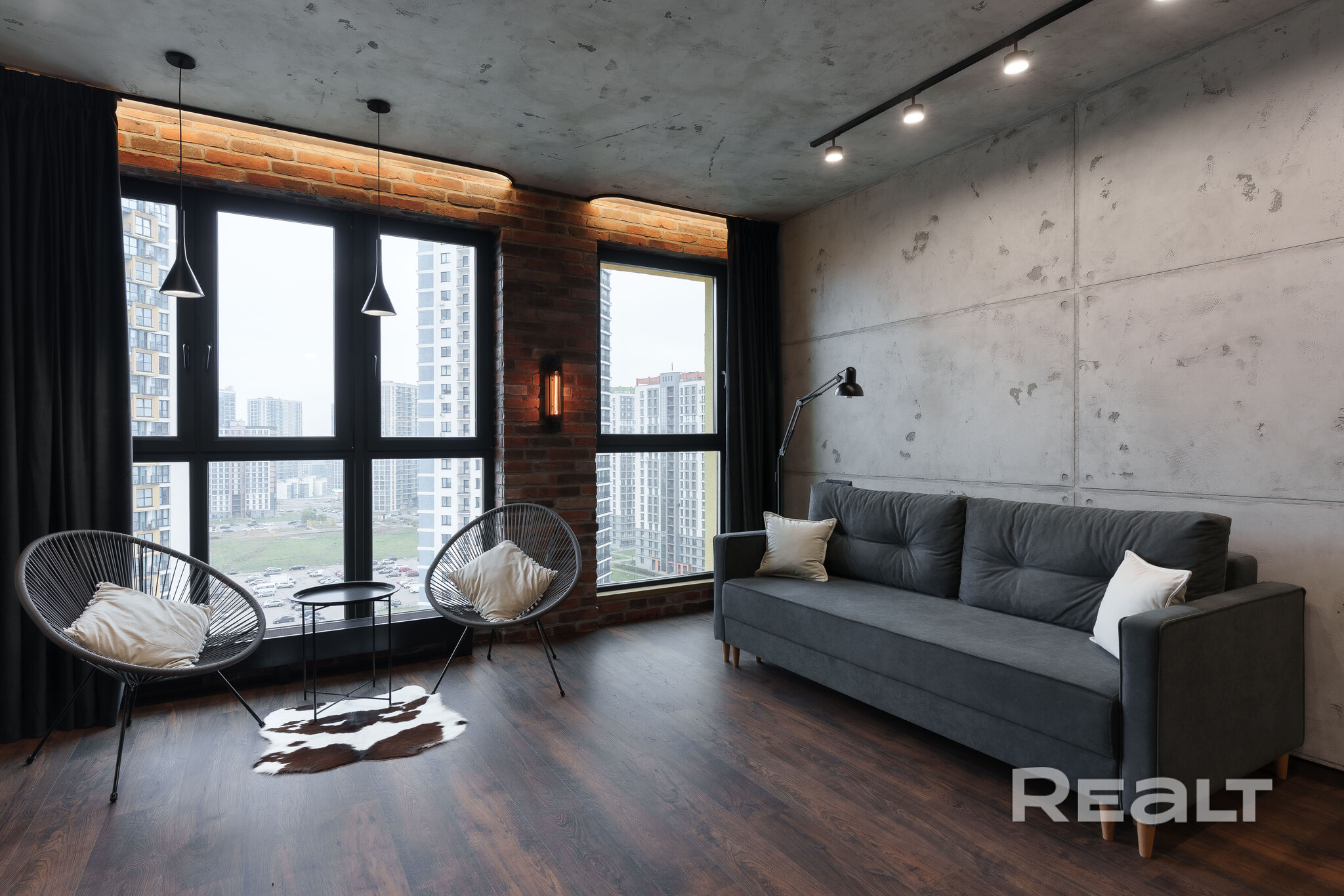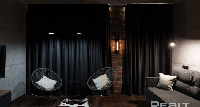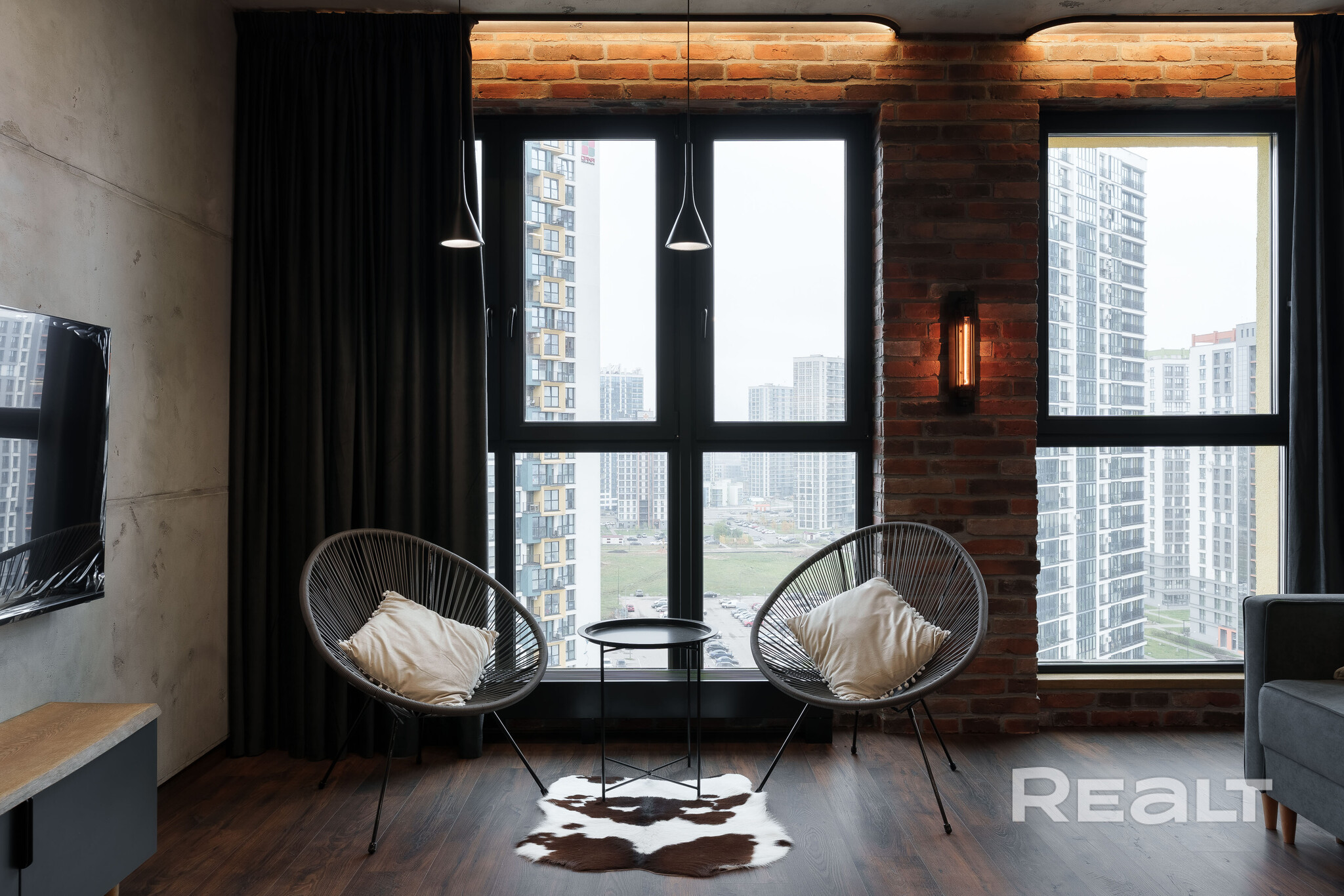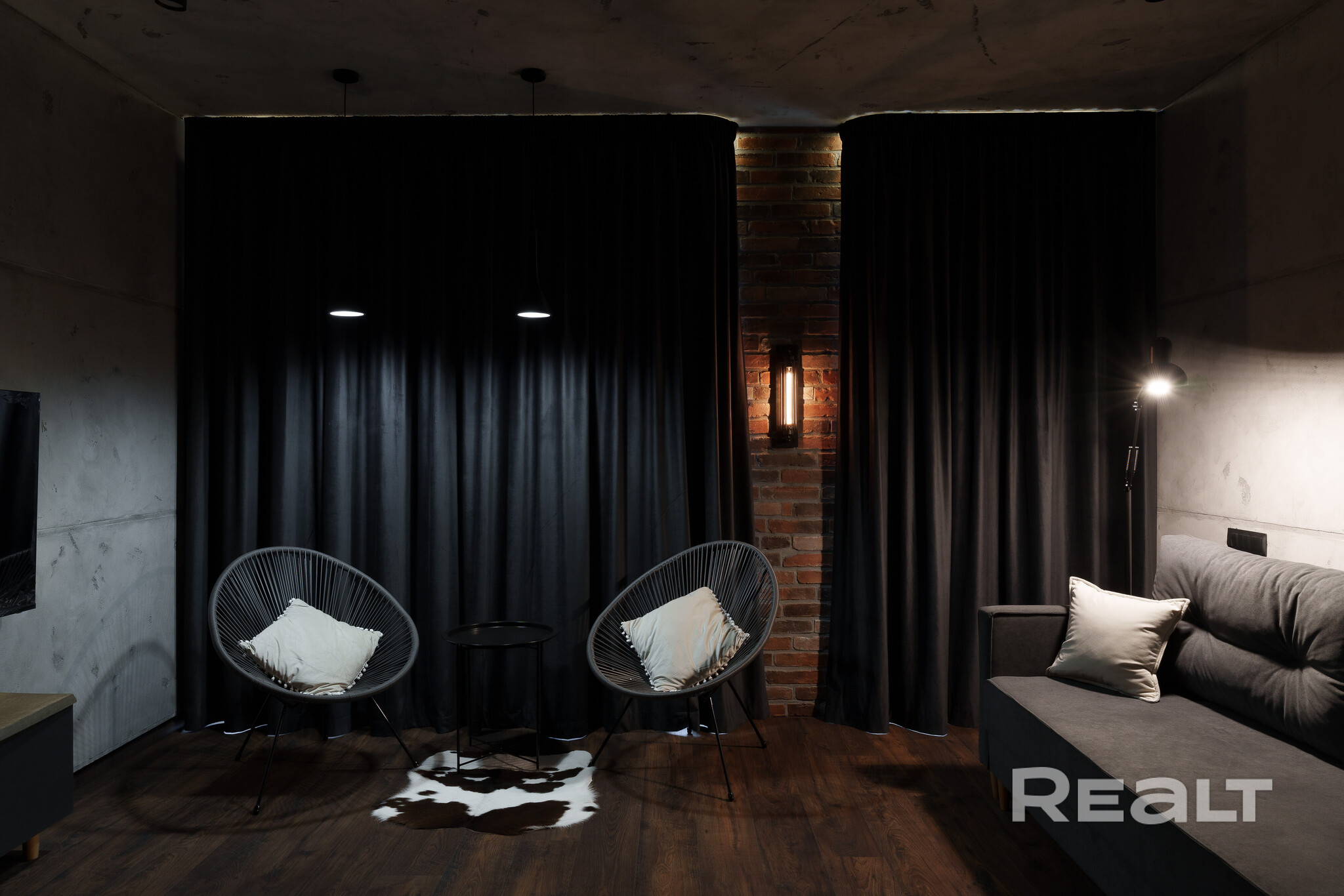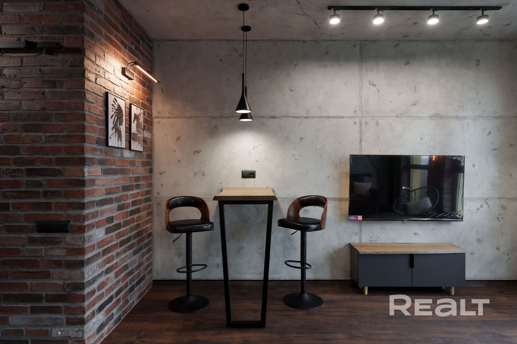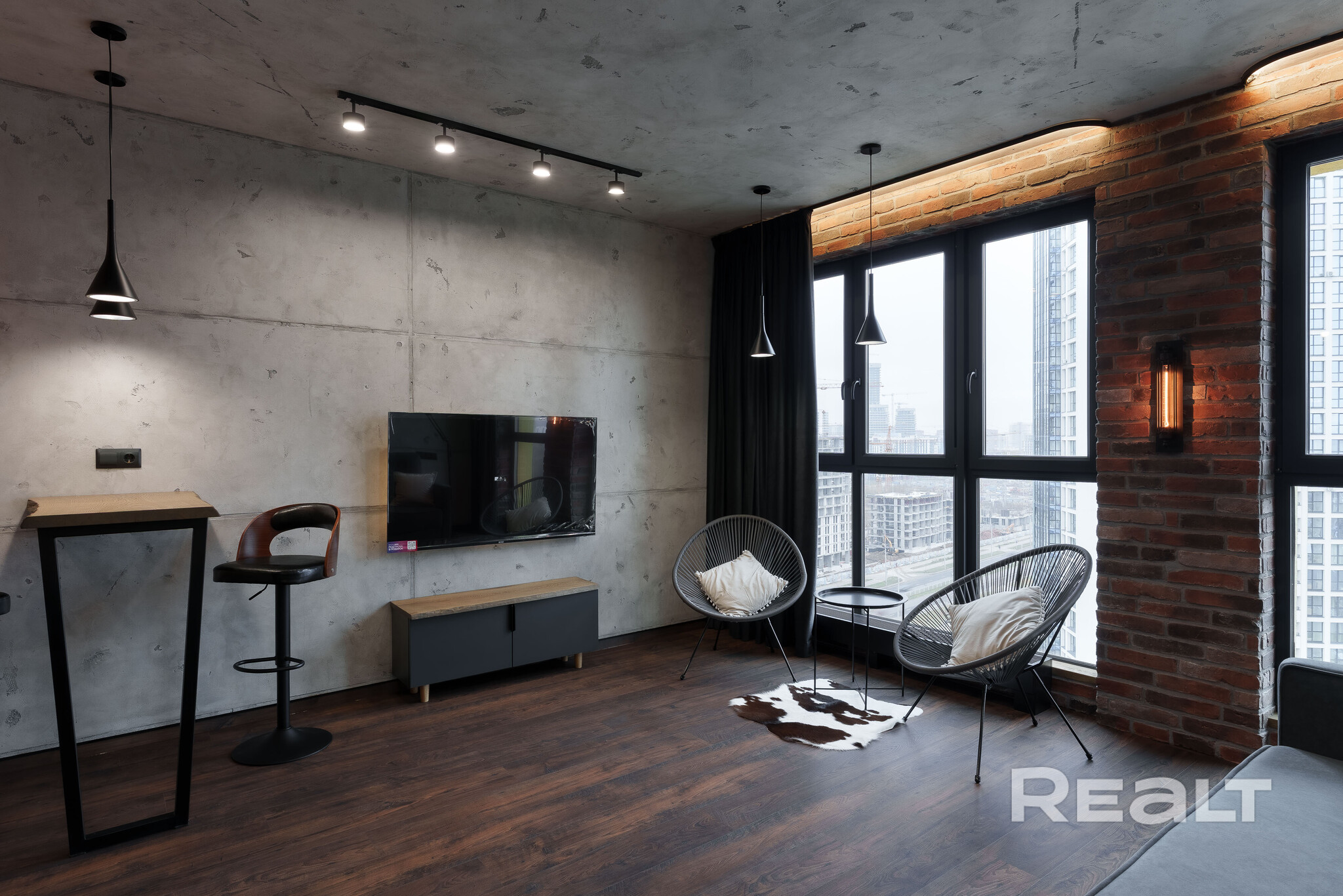 Студия расположена на 13-м этаже. Общий метраж — 30 квадратов. В квартире выполнен нестандартный ремонт. Установлены амбарные двери, на стенах штукатурка с фактурой.