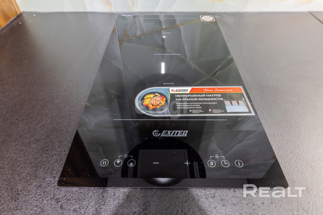 Общая площадь студии — 37 квадратов. На полу в зоне кухни уложена плитка, а в жилой зоне ламинат, стены выровнены и окрашены в светлый тон, потолок матовый натяжной с потолочными светильниками. В кухне из техники есть индукционная варочная поверхность, духовой шкаф, вытяжка и холодильник.