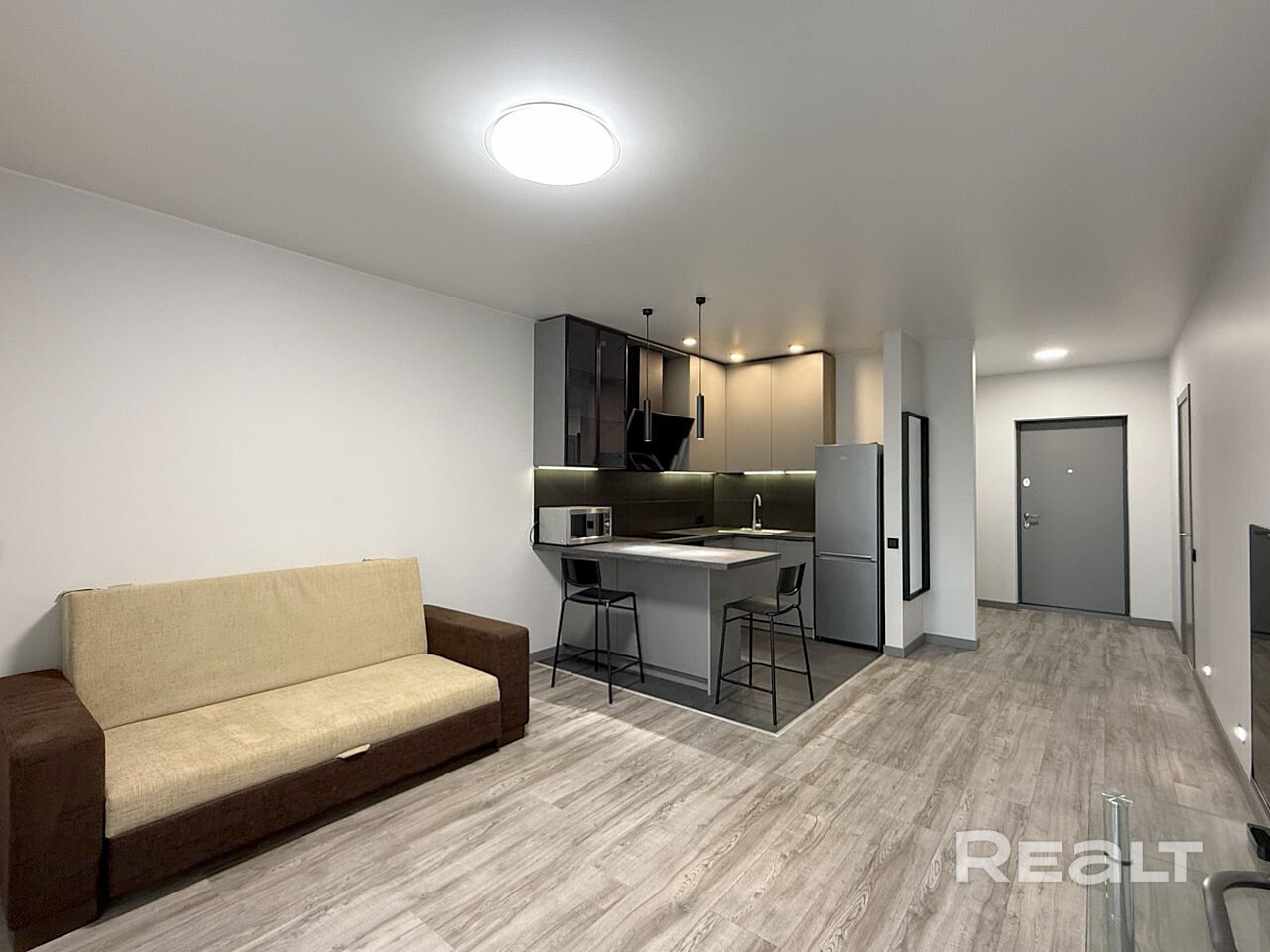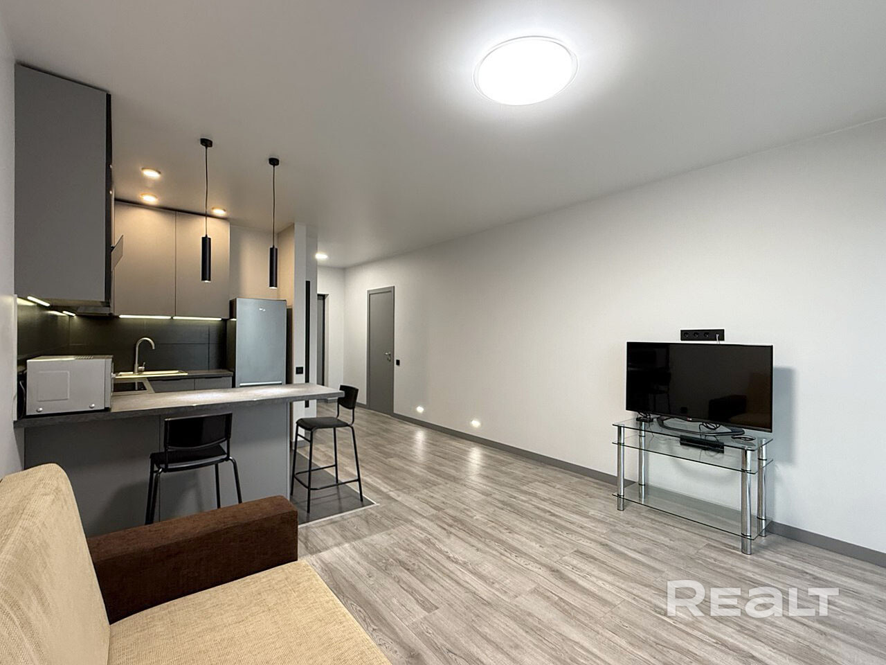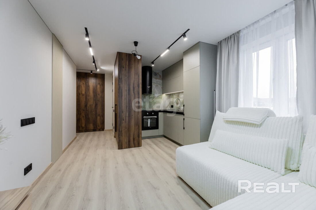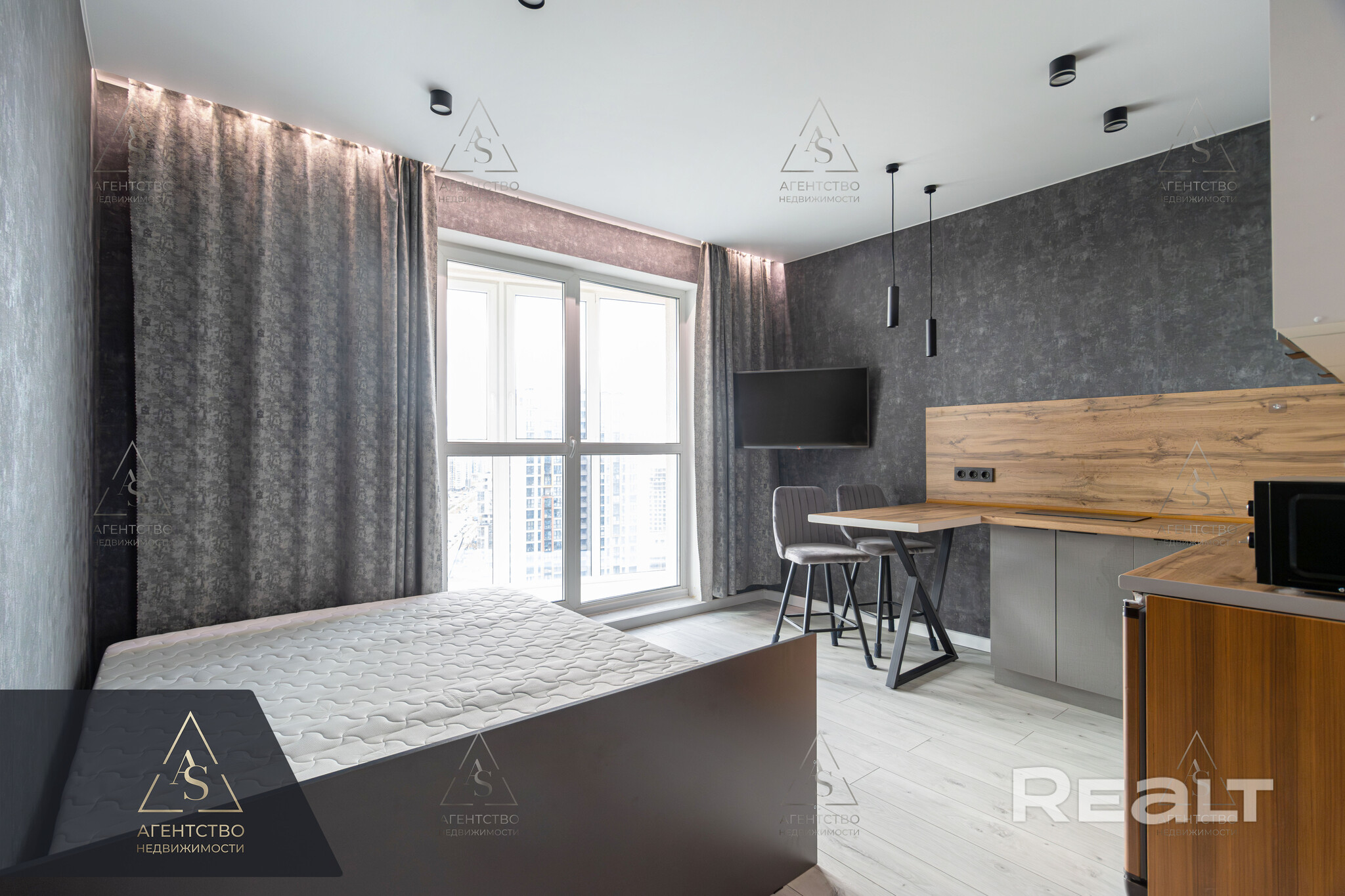 Начинаем нашу подборку с квартиры-студии в Минск-Мире по адресу Жореса Алферова, 16. Это 25-этажный дом 2023 года в квартале «Тропические острова». Рядом с домом остановка общественного транспорта.
