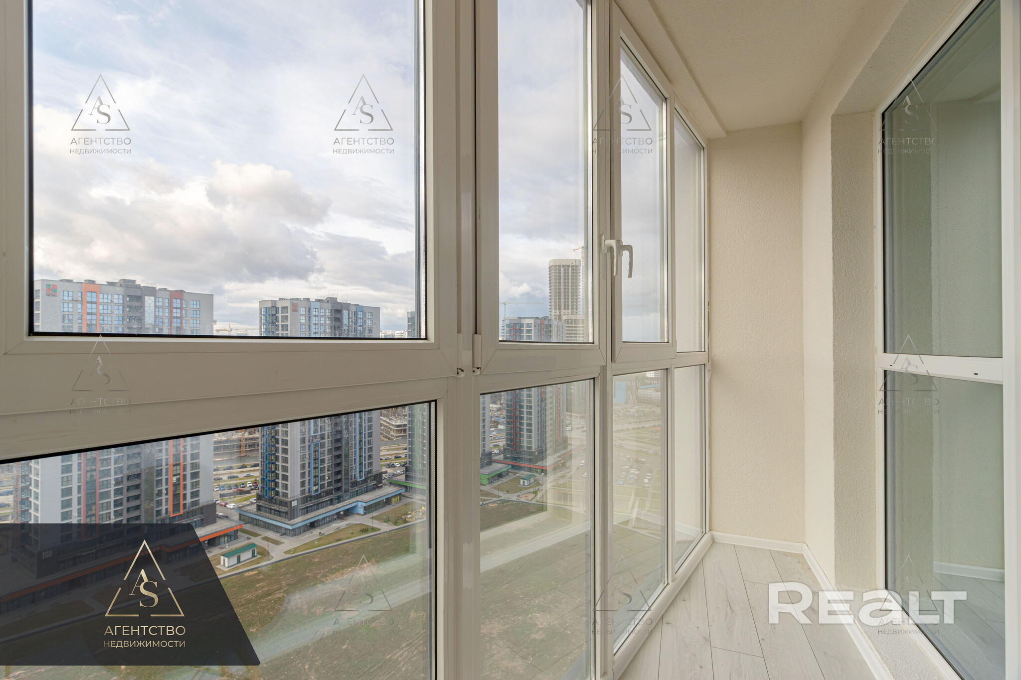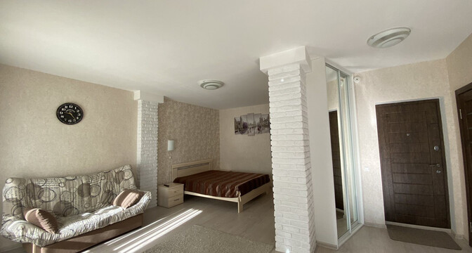 Квартира находится на 21-м этаже. Ее общая площадь — 26 квадратных метров. У входа оборудована система хранения для верхней одежды и других вещей. В комнате стоит двуспальная кровать. Есть выход на лоджию с панорамным остеклением. В совмещенном санузле установлена душевая кабина и подключена стиральная машина.