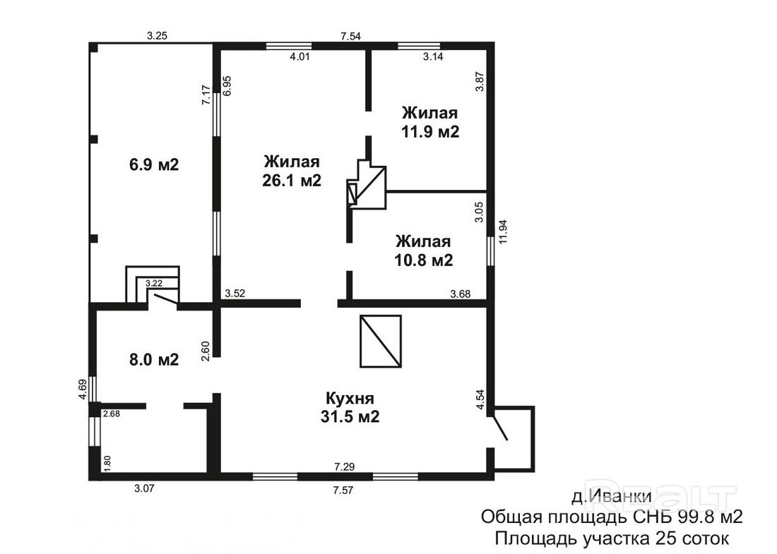Бревенчатый дом продается в деревне Иванки. Он хоть и выглядит аутентичным, но построили его в 2011 году в один этаж и с крытой террасой. На крыше лежит шифер. Площадь сруба — 80,3 м².