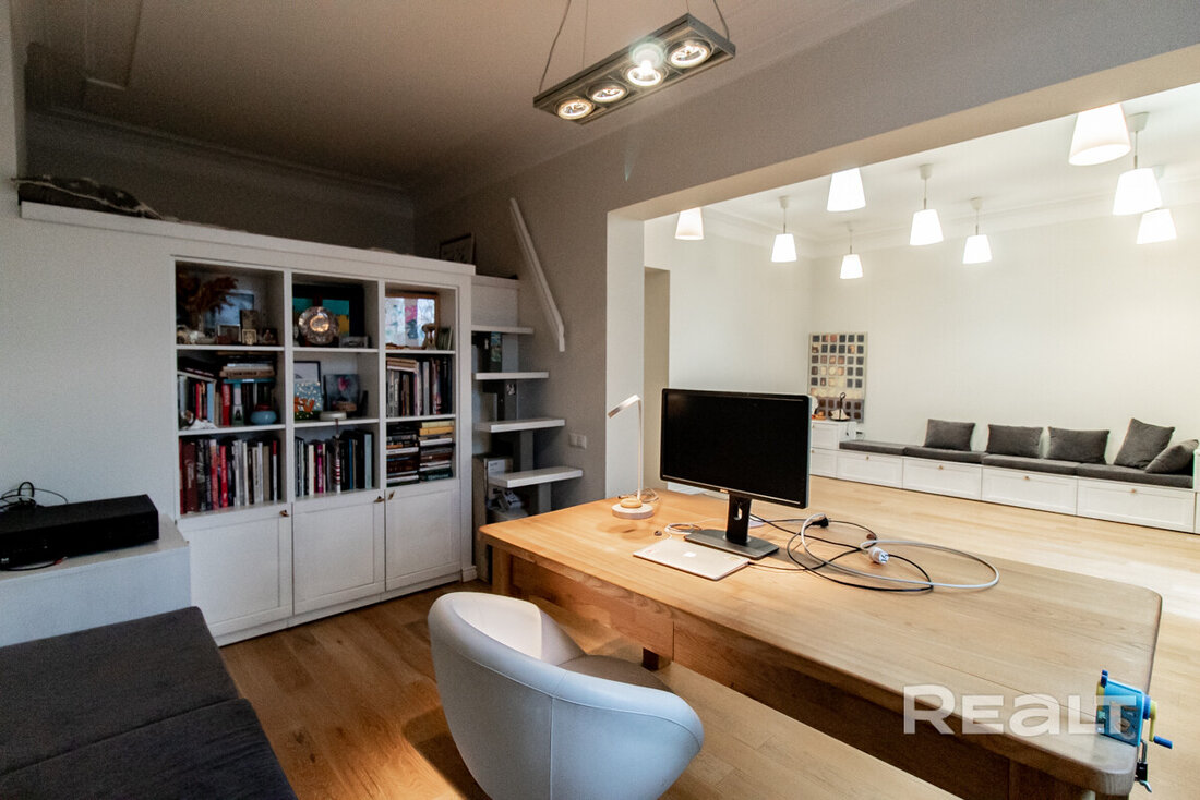 Вот как выглядит комната меньшей площади. Здесь оборудовали кабинет со спальным местом под потолком.
