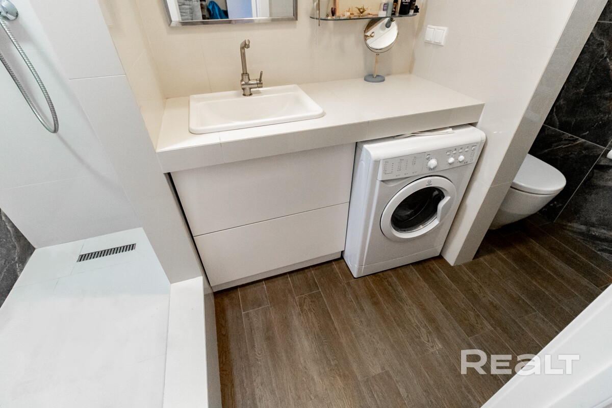 В ремонте используют светлые оттенки — часть стен и мебель белые, напольное покрытие тоже светлое. Есть два балкона. Один из них арочный.