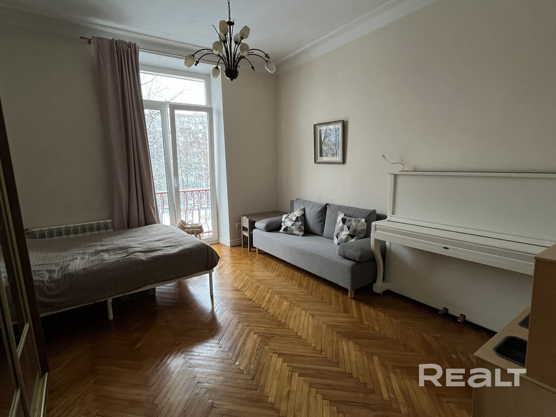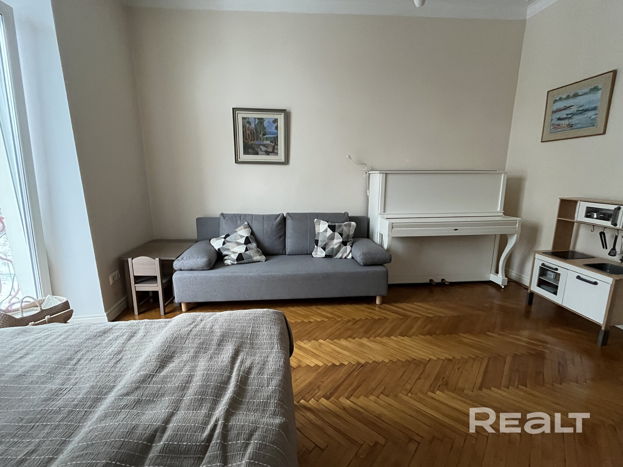 Квартира выставляется в хорошем состоянии. Она светлая, с высокими потолками. На полу лежит деревянное покрытие, в жилой комнате — паркет. Кухня обставлена гарнитуром и техникой.