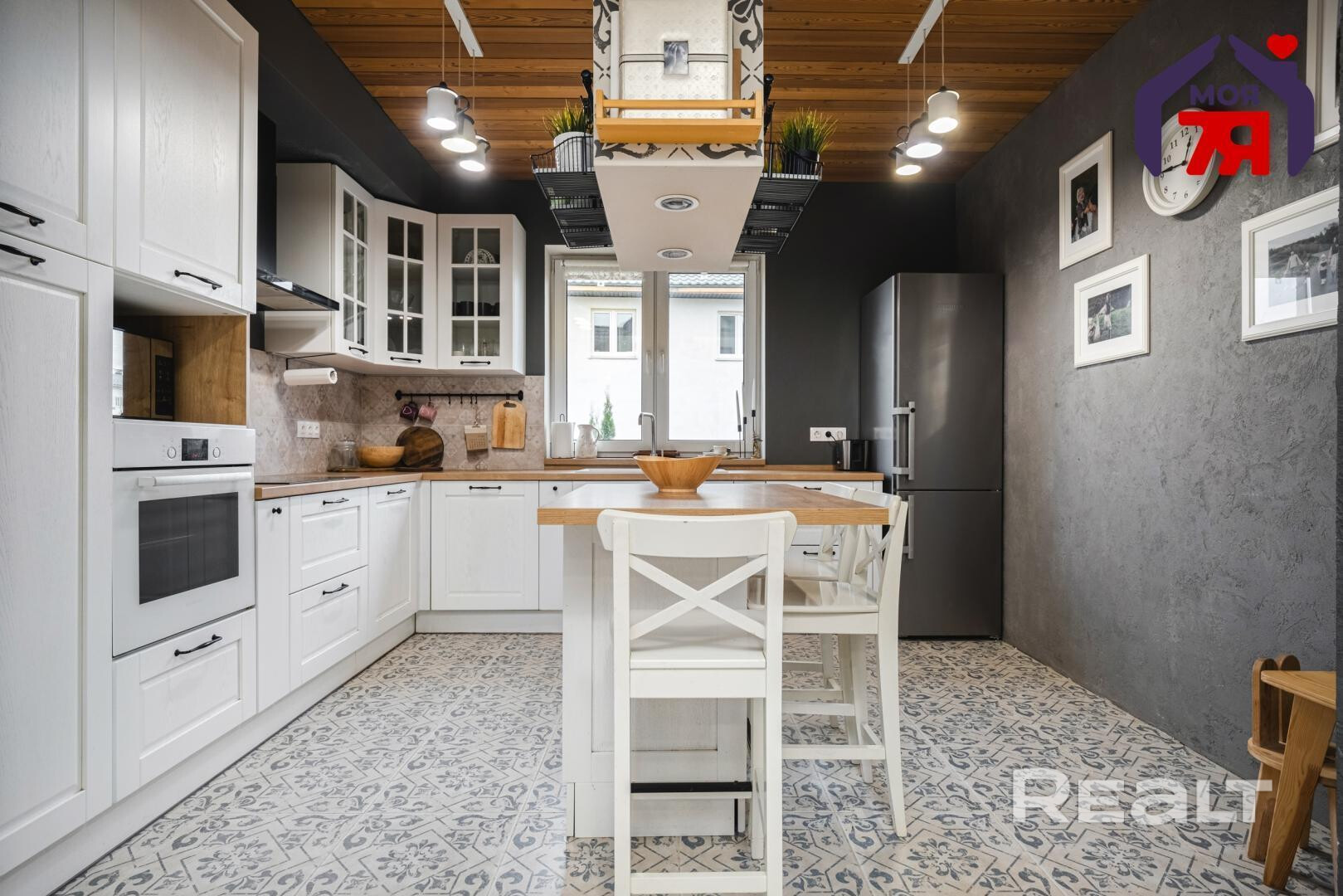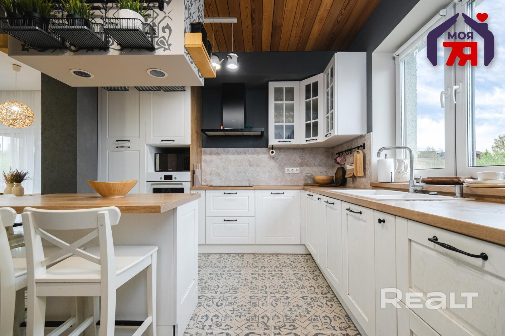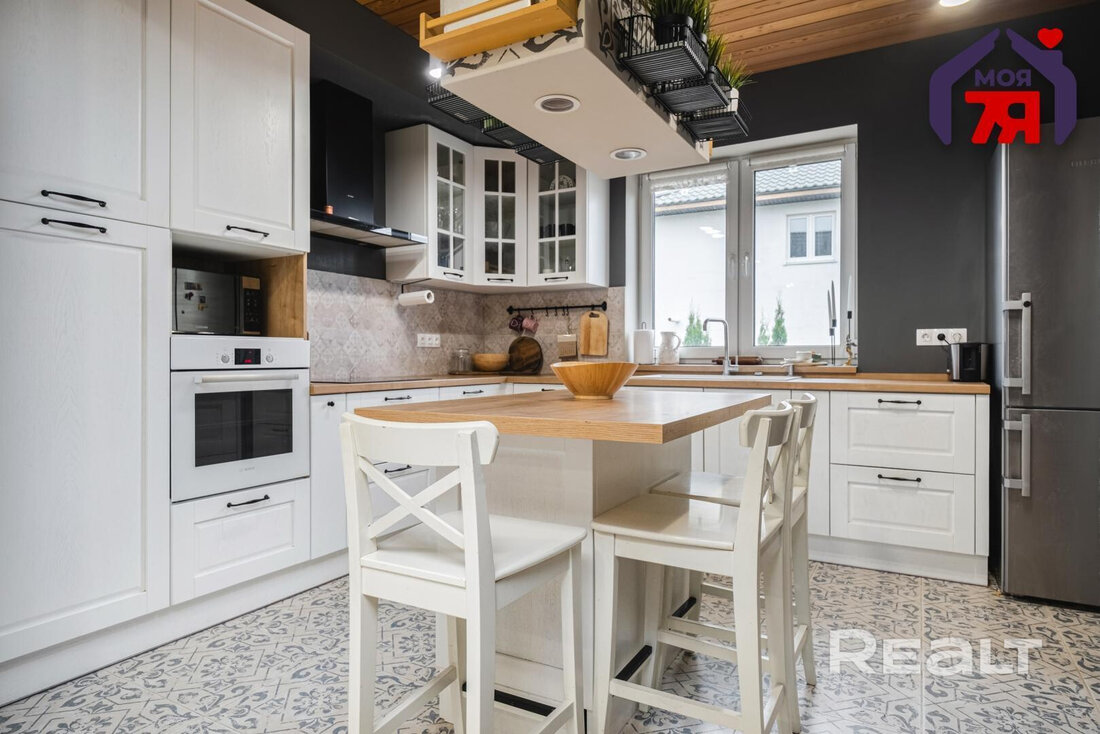 На первом этаже имеется кухня-гостиная. Здесь установлен гарнитур из массива дуба со встроенной техникой Bosch и Electrolux. Столешница — деревянная, имеется остров.