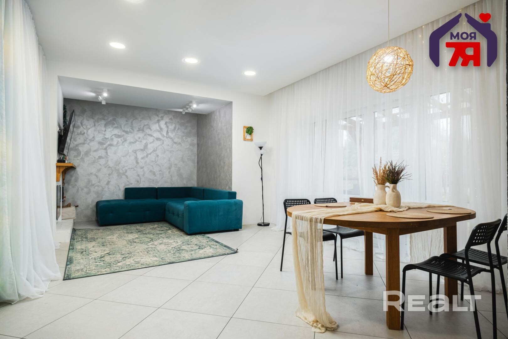 Светлый интерьер разбавляют натуральные материалы. Тут можно заметить декоративную штукатурку на стенах, натяжные и гипсокартонные потолки. На полу лежат плитка и паркетная доска.