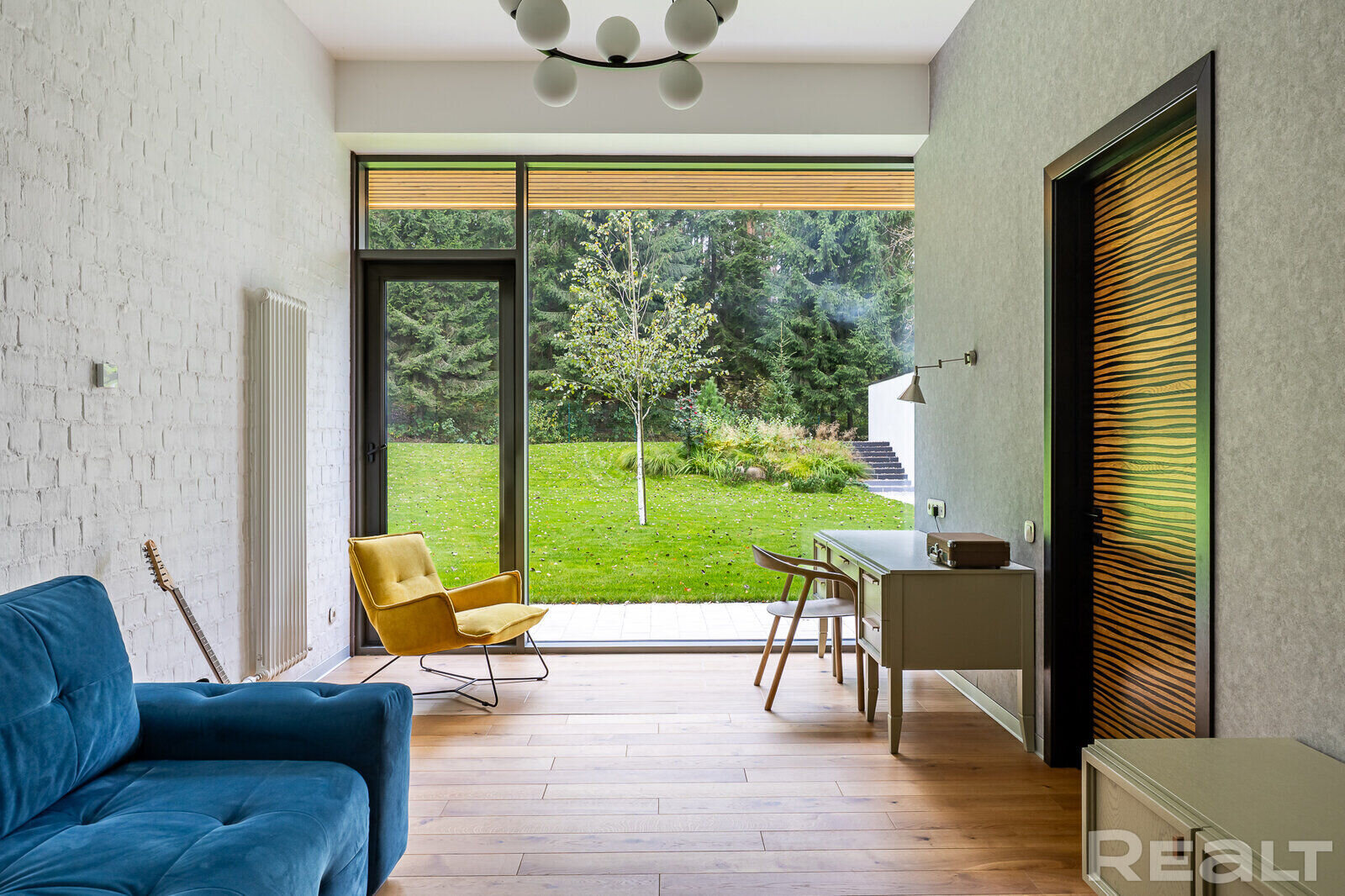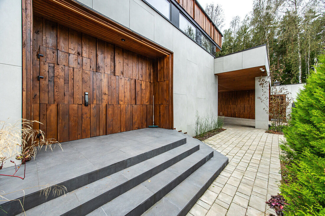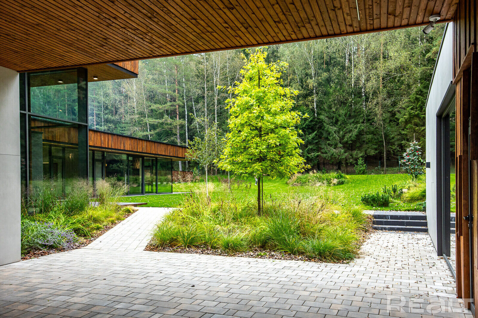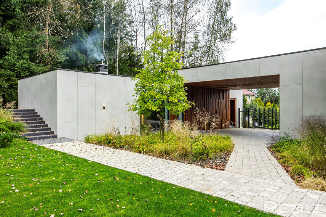 Этот дом не конкурирует с природой, а органично вписывается в контекст участка, граничащего с лесом. Чистые линии, строгие геометрические формы и функциональность каждого элемента создают образ современного, но при этом гармоничного строения.