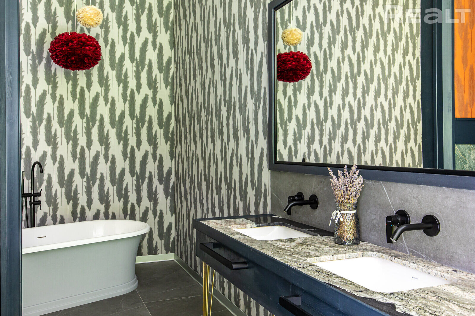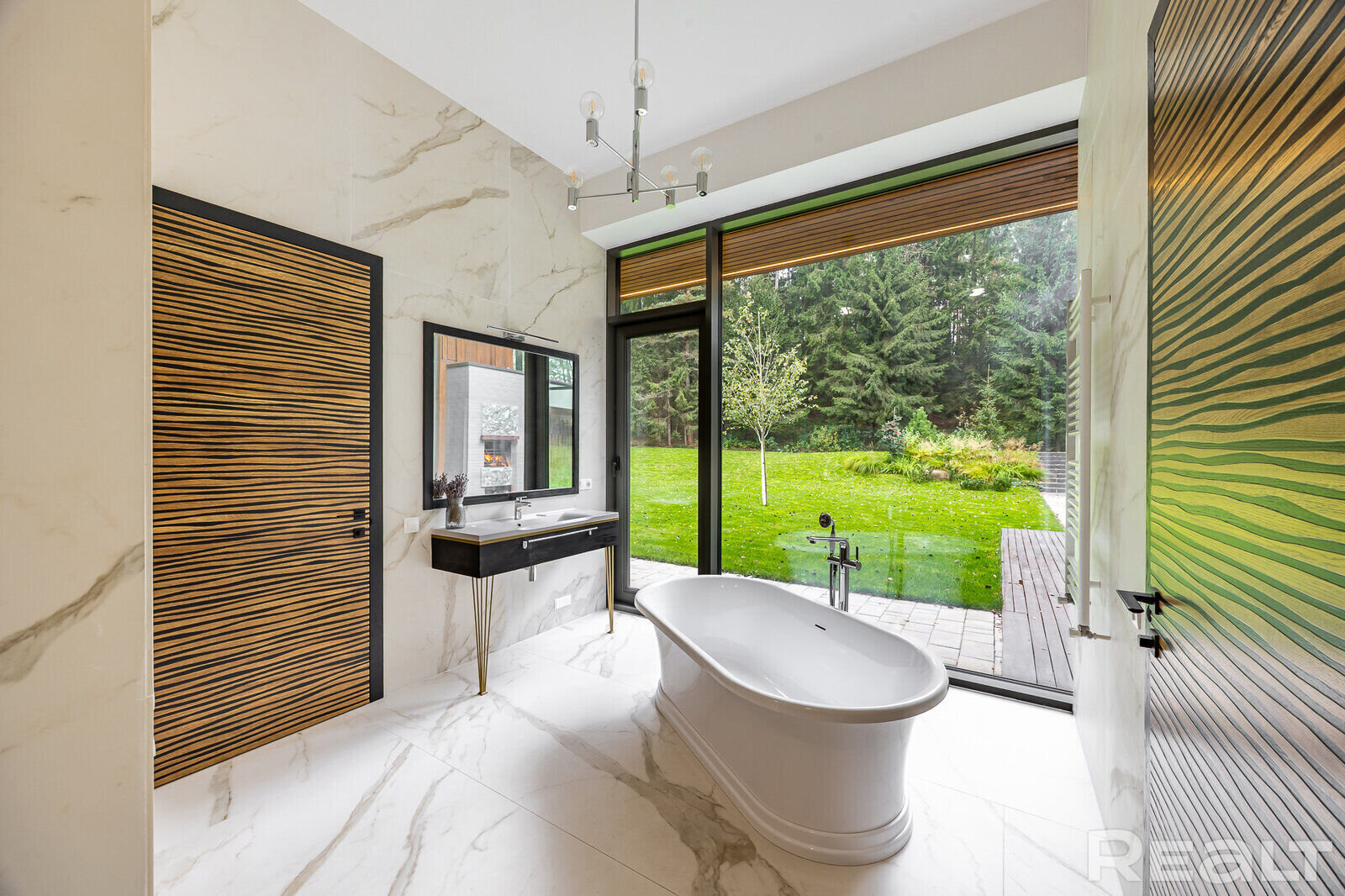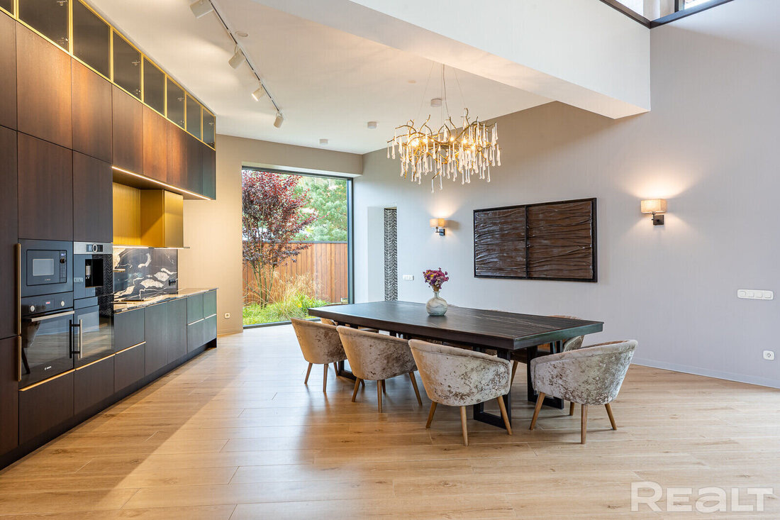 За утонченность отвечают итальянские сантехника, посуда, предметы освещения, мебель, столешницы из итальянского гранита. Натуральность подчеркивают паркетная доска и межкомнатные двери из массива дуба. Технологичность — немецкая бытовая техника. Главный акцент гостиной — английский открытый камин в гранитной облицовке. Он создает атмосферу роскоши и уюта. Дополнительный камин предусмотрен на террасе. Эффектность общих зон усиливается за счёт высоты потолка и ленточного остекления под самой крышей.