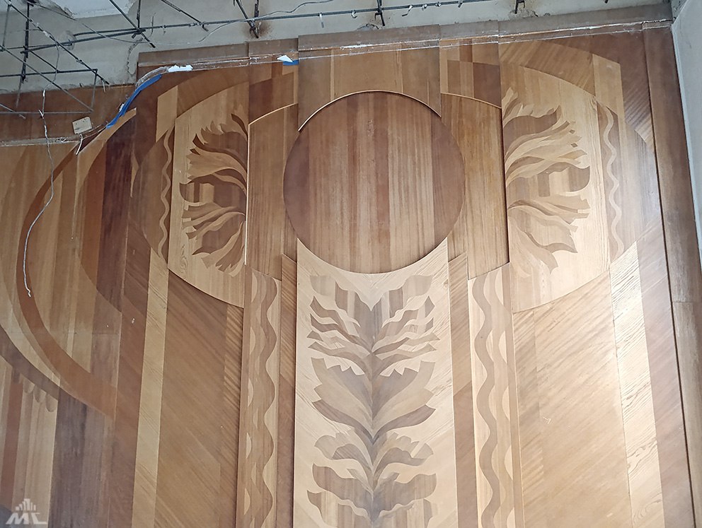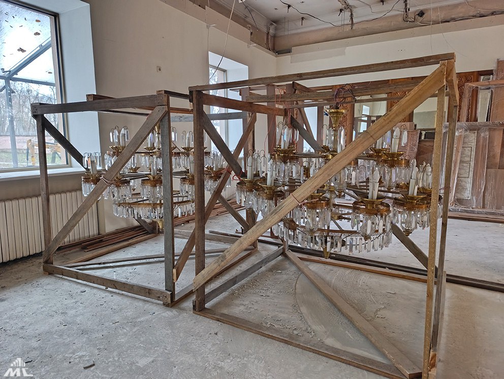 Ждут отправки на реставрацию три люстры, деревянные двери с резными элементами, зашивки радиаторов, зеркала в декоративных рамах. Они уедут в мастерские, а декоративные панно отреставрируют на месте.