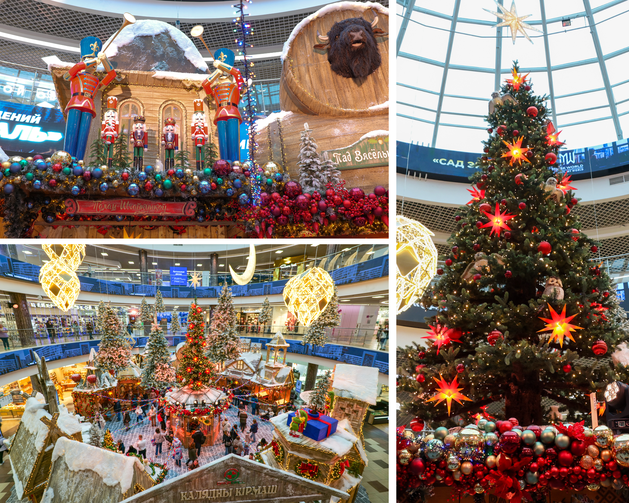 Именно здесь расположен крупный торговый центр Dana Mall — место выгодных покупок для всей семьи. Каждый год в декабре центр открывает впечатляющую новогоднюю инсталляцию и дарит своим посетителям ощущение праздника. В этом году здесь — Калядный кiрмаш — сказочная ярмарка, наполненная деталями, звуками и символами белорусского Нового года.