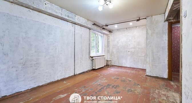 Квартира нуждается в ремонте. На полу тут лежат доски, а сверху — линолеум, санузлы облицованы плиткой. В окнах стоят стеклопакеты, а из комнаты можно выйти на балкон. Жилье практически освобождено от мебели.