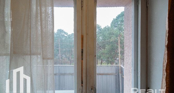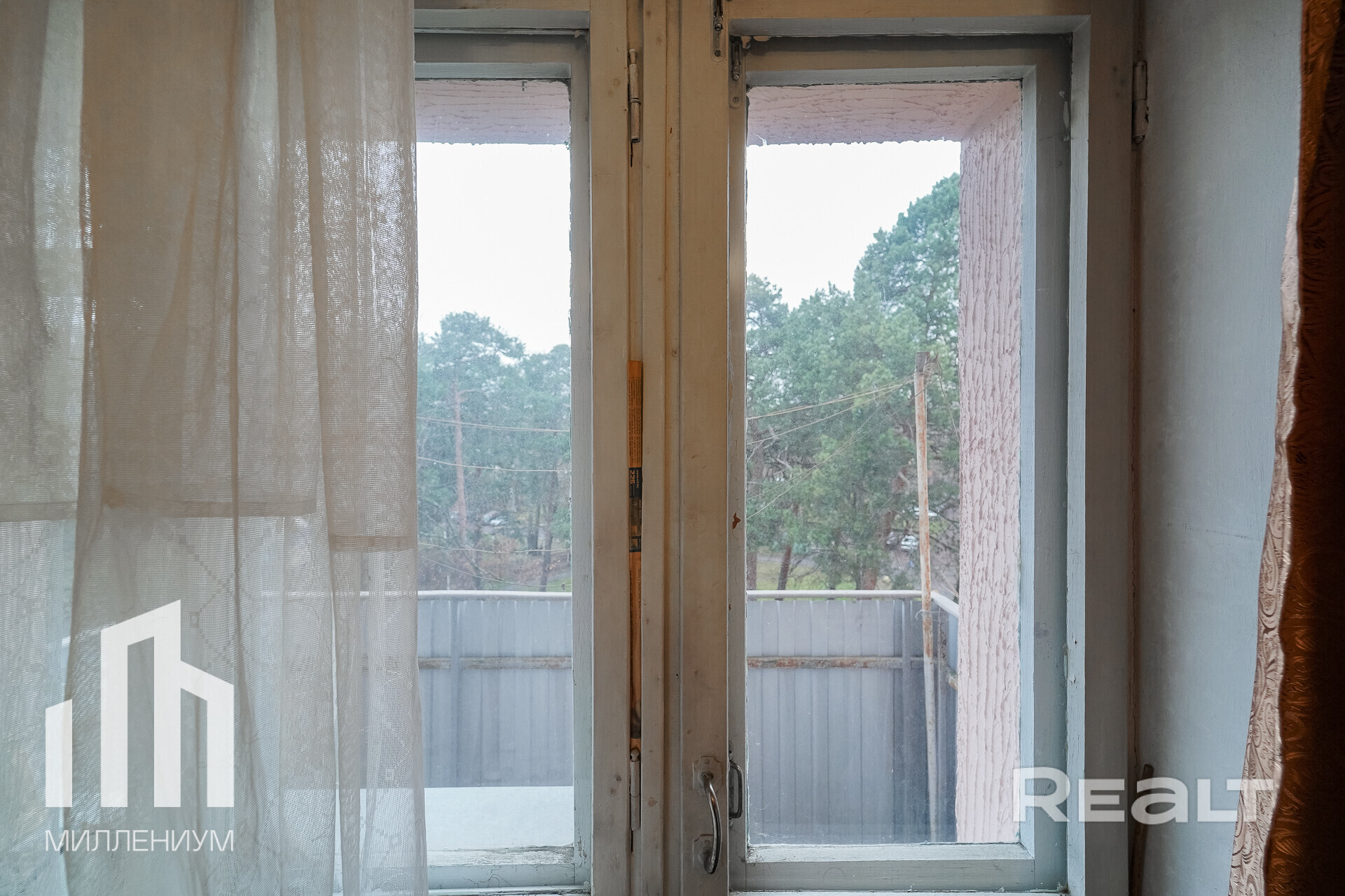 Квартира требует капитального обновления. Тут лежат доски на полу, стоят старые окна. Из комнаты имеется выход на балкон.