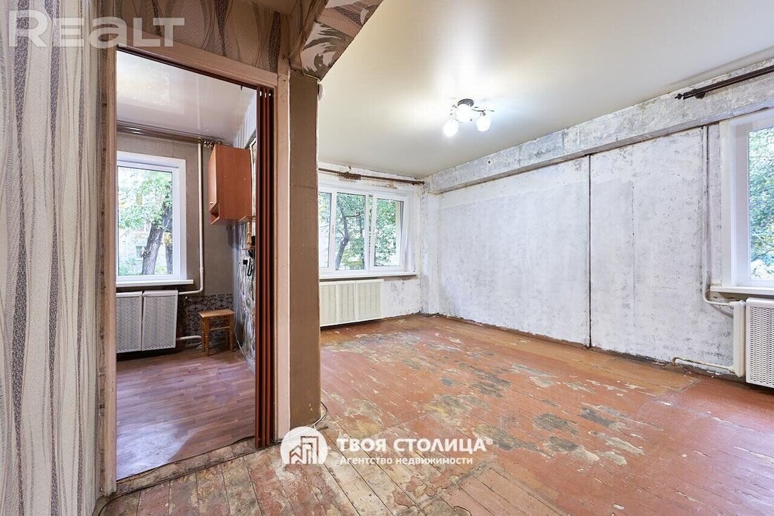 Квартира — угловая, в комнате есть два окна. Старую отделку частично демонтировали. С гарнитуром и техникой осталась только кухня. На полу лежат доски, в окнах стоят стеклопакеты.