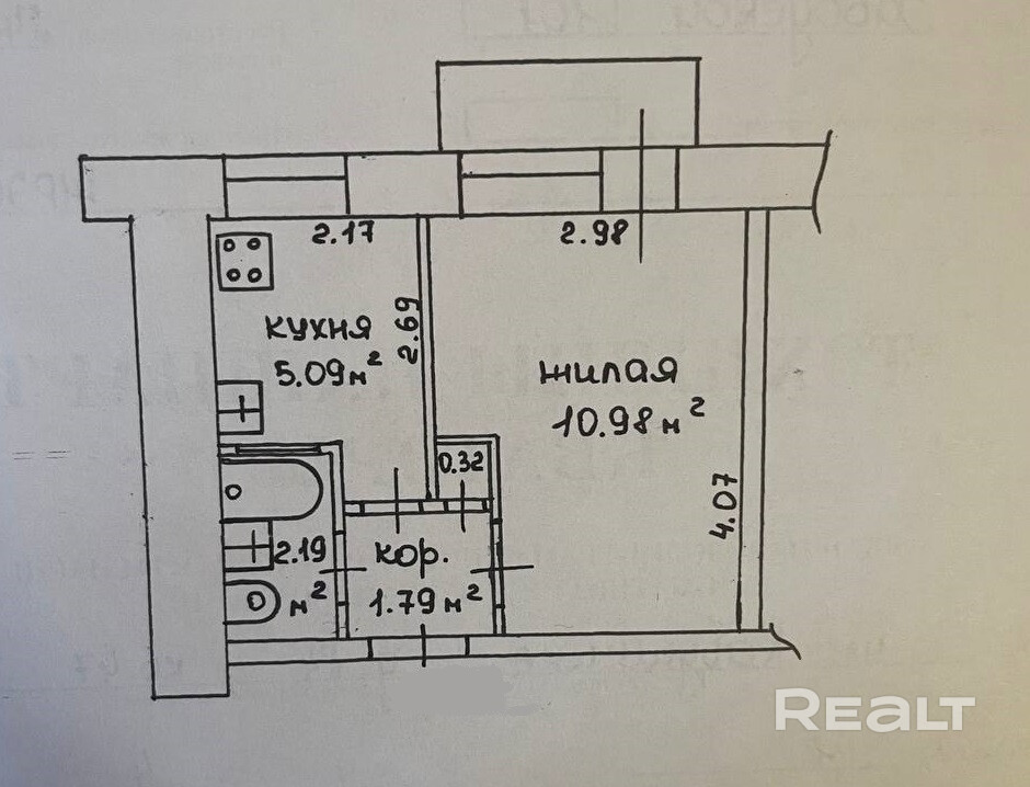 На четвертом этаже пятиэтажки на Пуховичской, 19 продается однушка в 30,9 м² с кухней в 5,6 метра. Дом построили в 1966 году, а в 2021-м в нем провели капремонт.