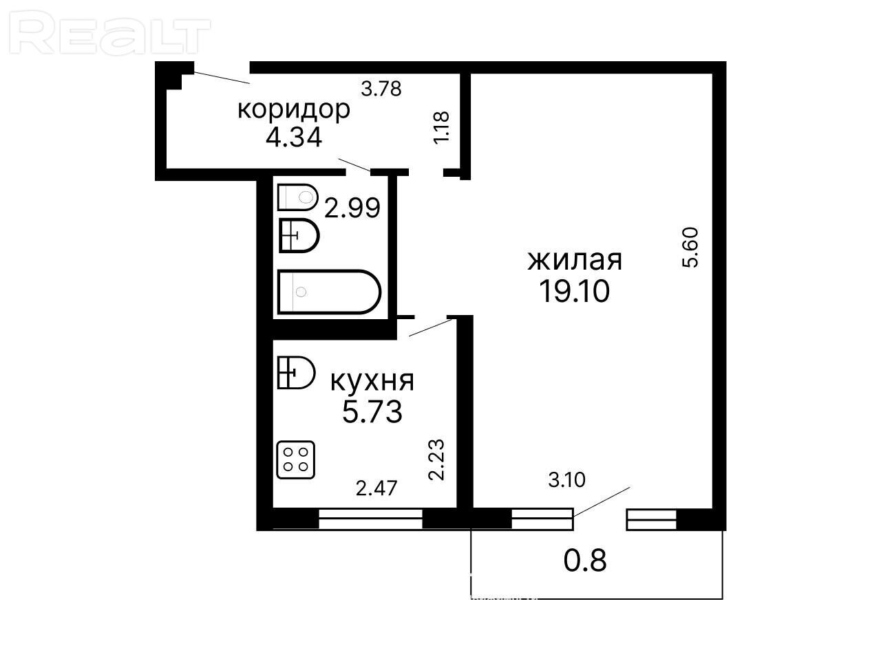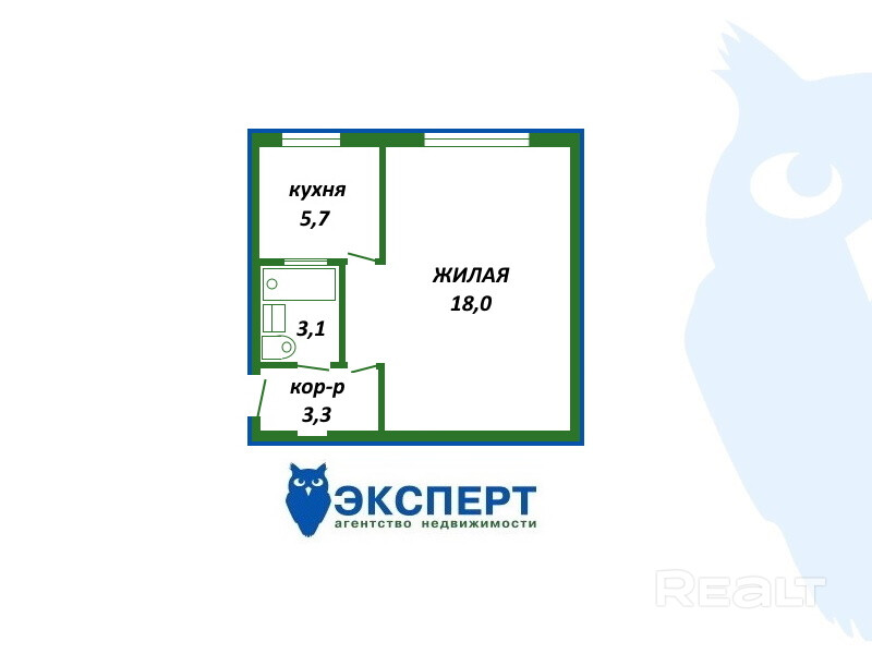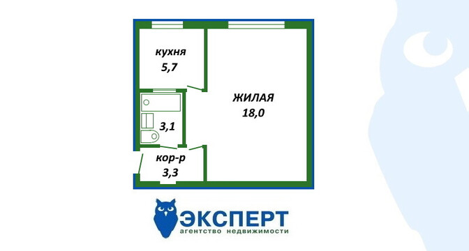 Метраж в этой однушке приблизительно такой же, как и в предыдущей. Общая площадь — 32 квадрата, жилая — 19, кухня — 6 квадратов.