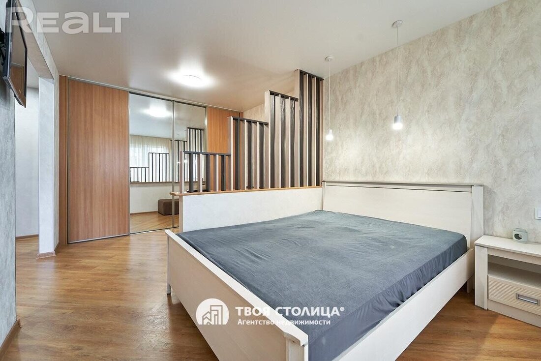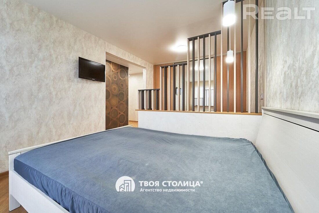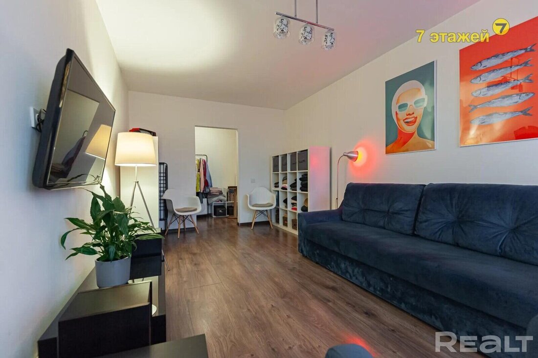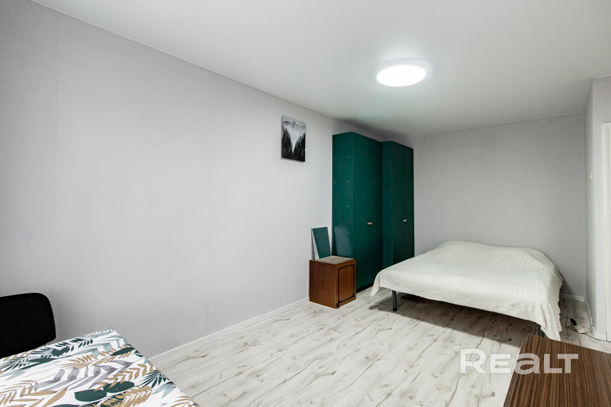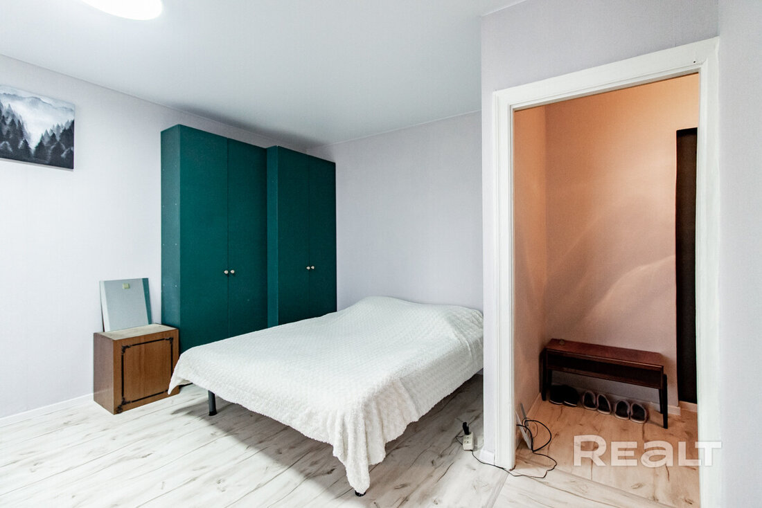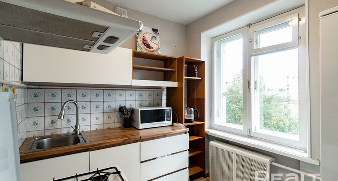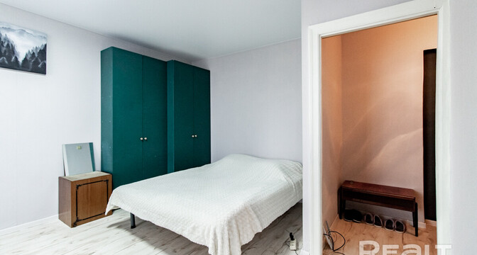 Начинаем традиционно нашу подборку с самого бюджетного варианта. Это однокомнатная квартира на пятом этаже пятиэтажного кирпичного дома на Коласа, 34. Это меньше 800 метров или около десяти минут пешком до станции метро «Академия наук».