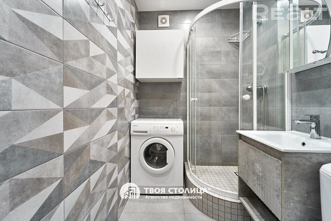 Санузел совмещенный, выполнен в серых оттенках. Установлена душевая кабина, подключена стиральная машина.