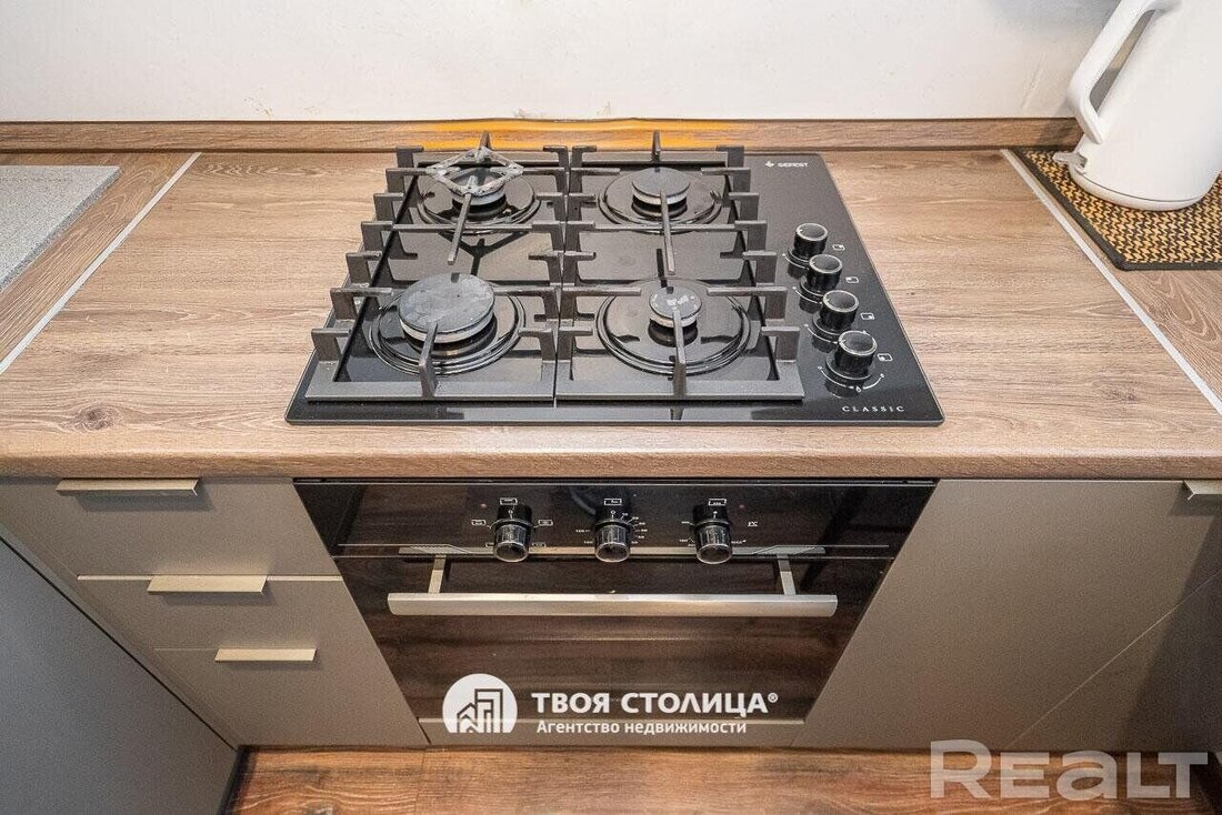 Общая площадь — 33 метра, 17 из них приходится на жилую, а еще 6 на кухню. В кухне из техники есть холодильник, варочная поверхность, духовой шкаф.