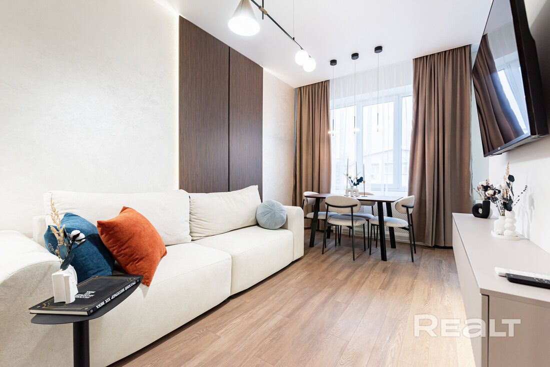 Обеденный стол со стульями для экономии места в небольшой кухне разместили в гостиной. В этой комнате светлые стены и напольное покрытие. Есть диван и телевизор.